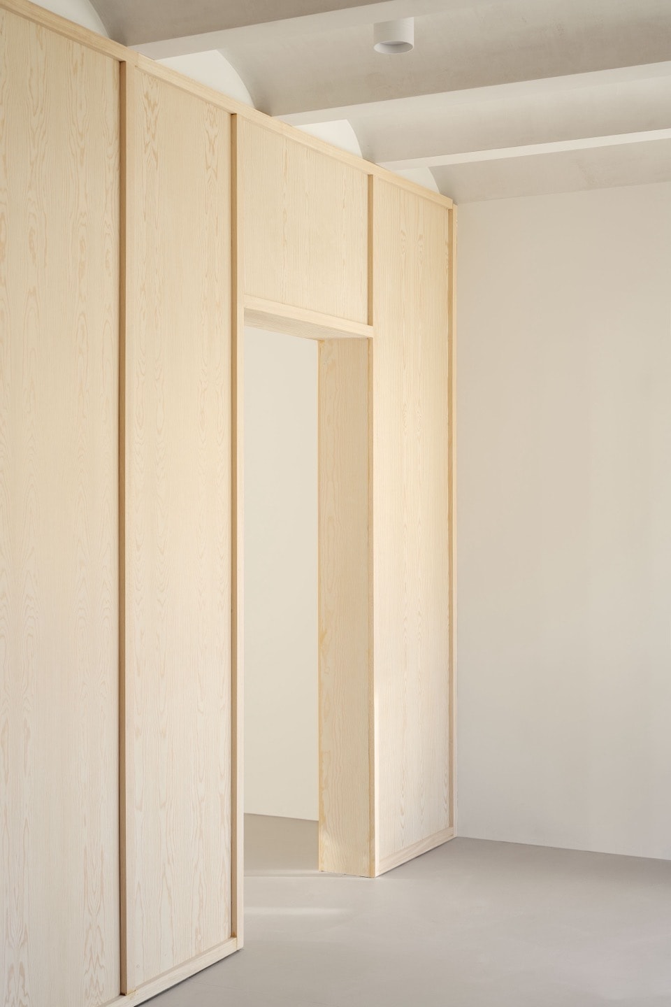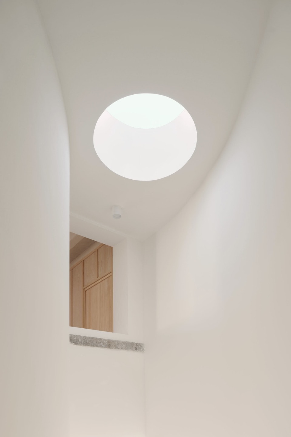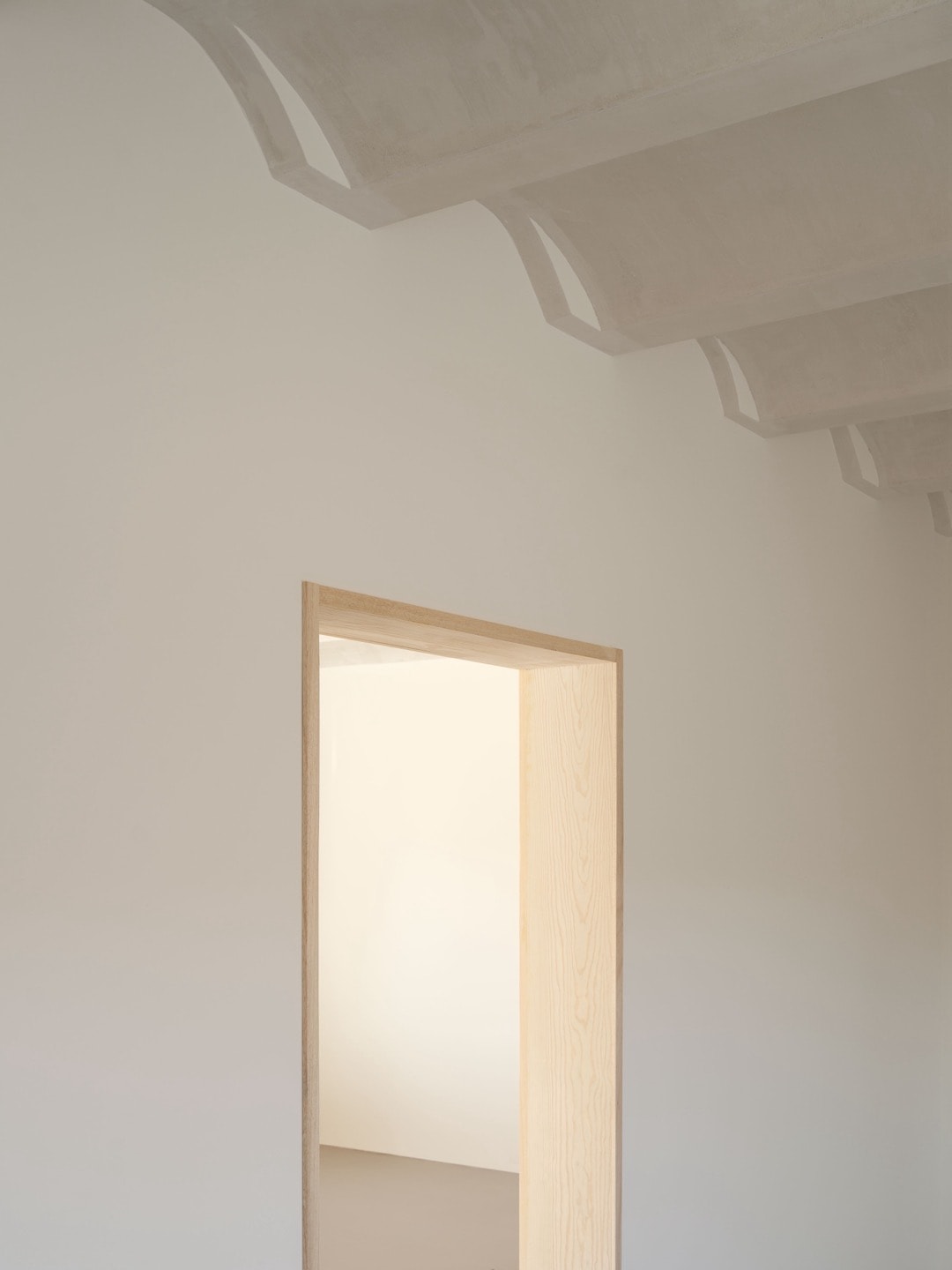El blanco cubre la gran mayoría de paredes y techos. Entre estos últimos, destaca la singular cubierta de bóvedas. La geometría de este elemento se potencia con el fin de otorgarle el protagonismo que merece.