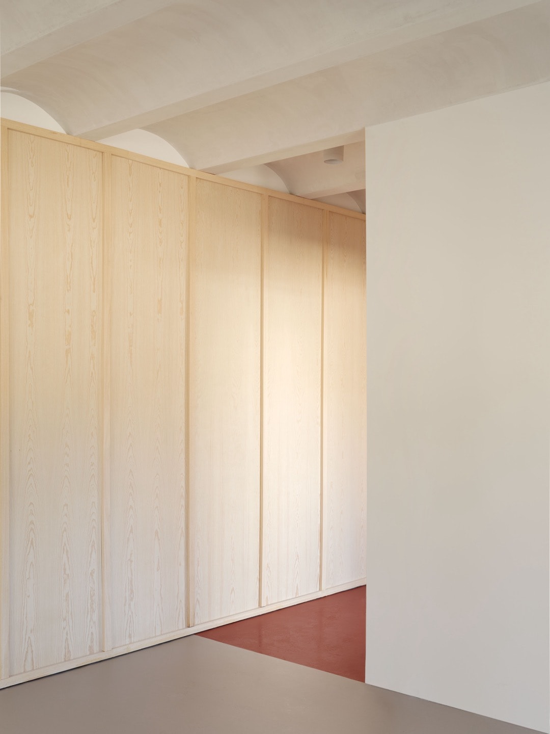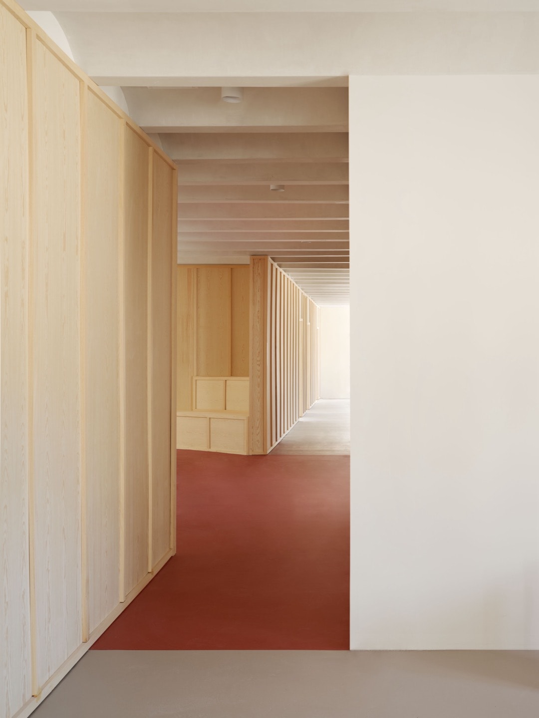 Toda esta franja se reviste de un panelado de madera que otorga presencia y parece remarcar, en mayor medida, el acceso a cada uno de los programas. La calidez de la madera en los paramentos verticales y el colorido aportado por medio del linóleo rojo en ciertos pavimientos, contrasta con la neutralidad del resto de tonos.