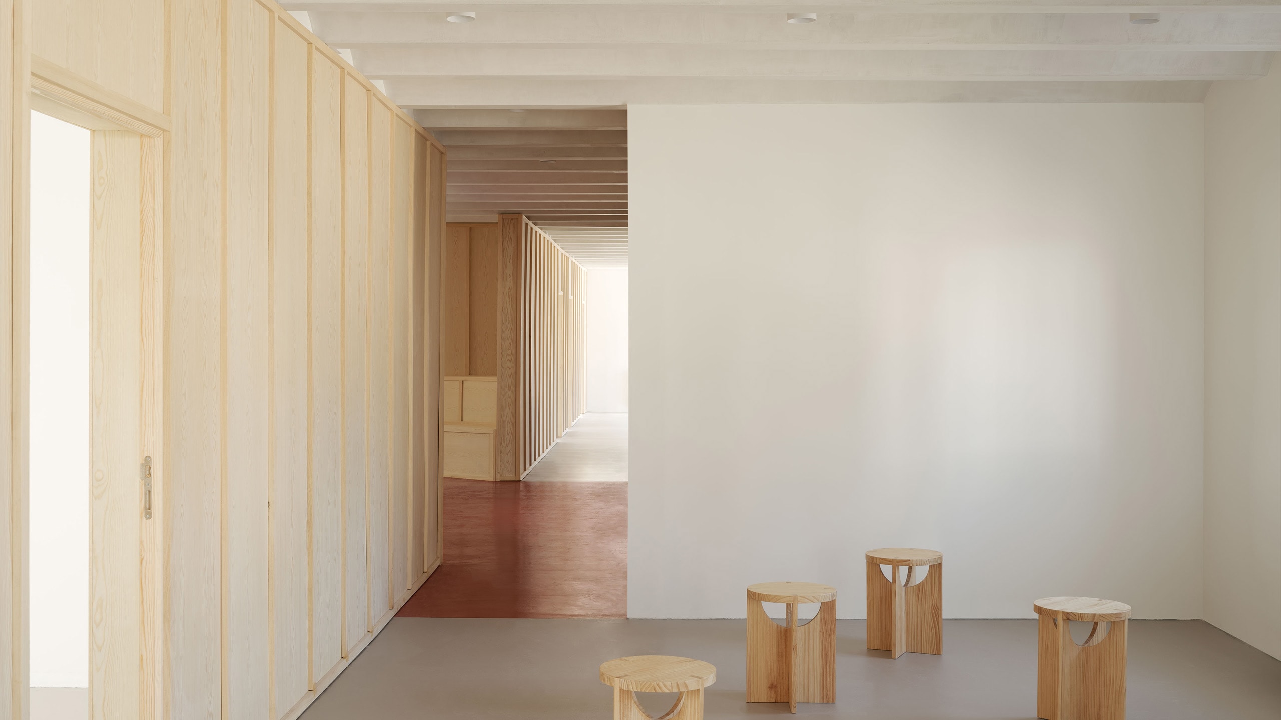 Coincidiendo con la zona de llegada, se plantea un espacio de acogida que remata el semicírculo y construye su contorno por medio de una bancada de madera. Desde este punto, el usuario conecta con una especie de gran pasillo, que actúa como espina dorsal, y da acceso a cada una de las salas.