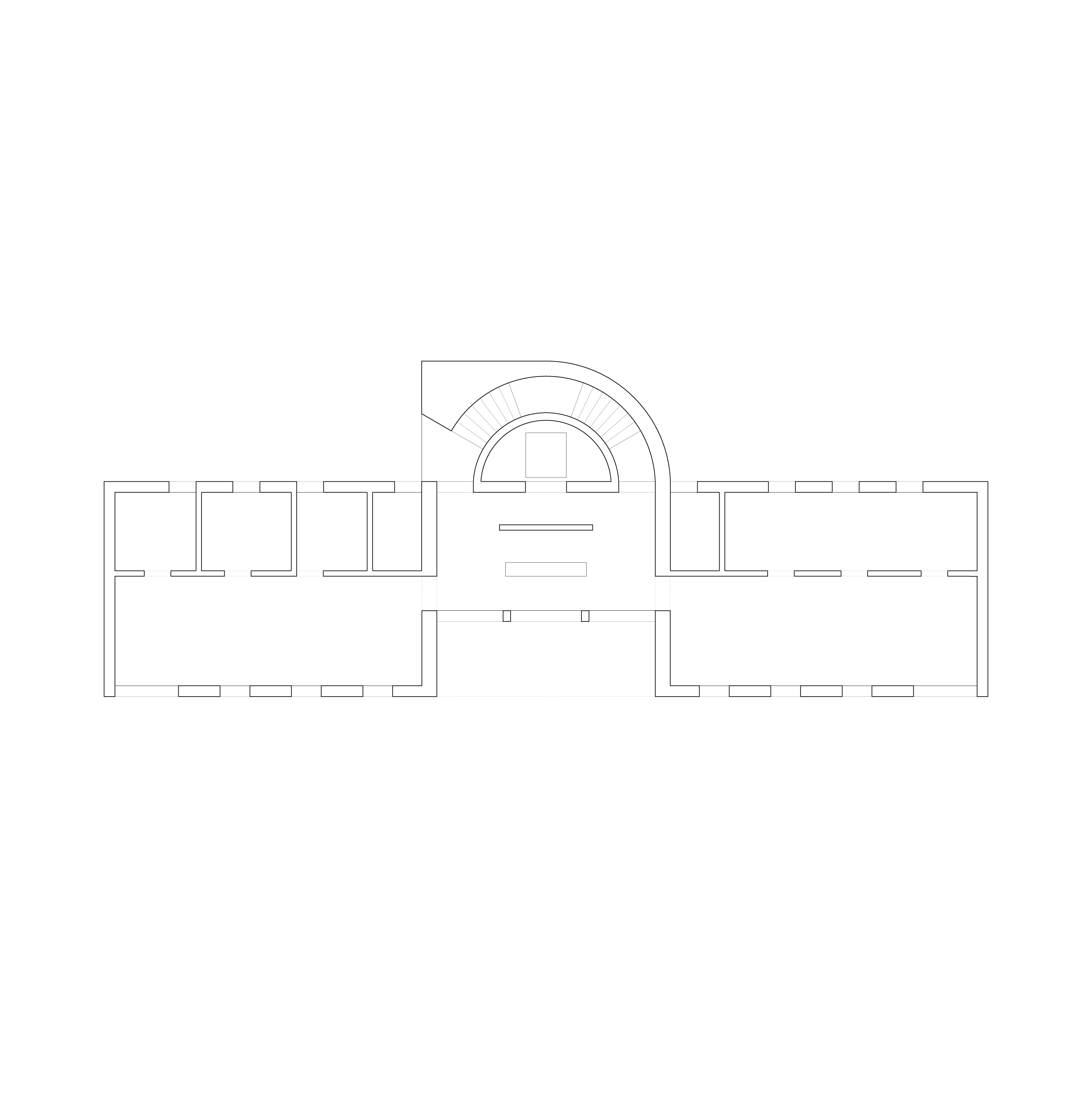 A la hora de intervenir, se actúa sobre la totalidad de la planta primera con el objetivo de incorporar este espacio a la actividad cultural del edificio. Se diseña un nuevo núcleo de comunicación cuya forma semicircular se adosa al edificio en el centro de la configuración.