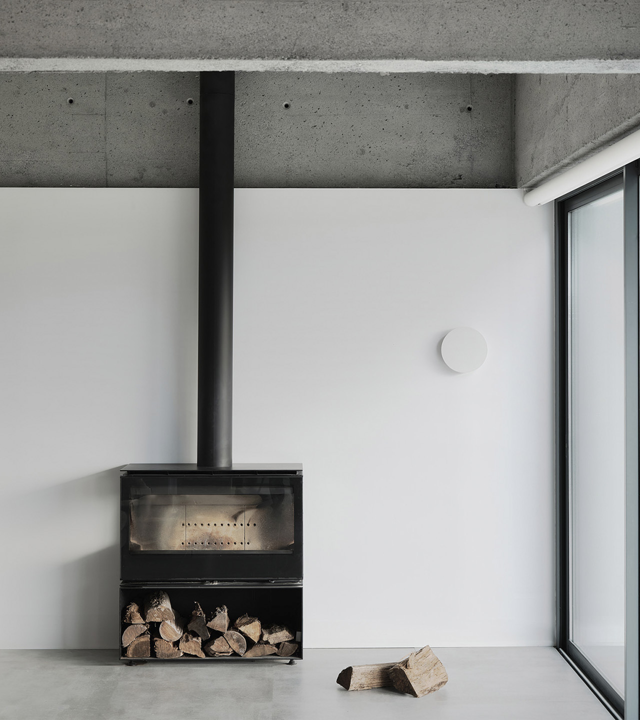 Su rotundidad ofrece un aspecto contundente que soporta todo lo que se coloca sobre él. Esta caja fuerte, de aspecto estereotómico, se perfora con una serie de huecos que dejan intuir los dormitorios y baños. Un volumen compacto que acoge en su interior el programa más nocturno y privado de la vivienda.