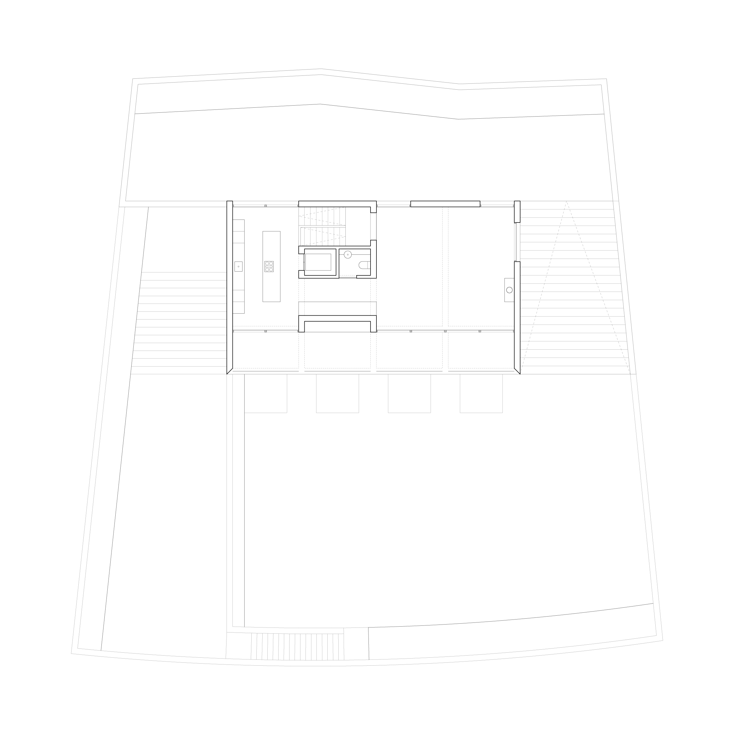 Aprovechando este panorama, este espacio recibe la zona de día, siendo el salón y la cocina los principales usos. Su planta libre promueve un espacio diáfano que dirige sus vistas hacia el paisaje.