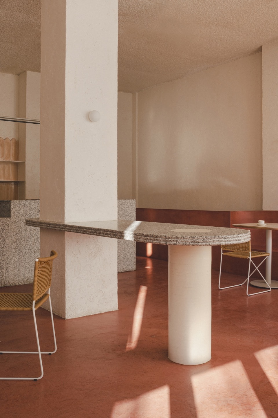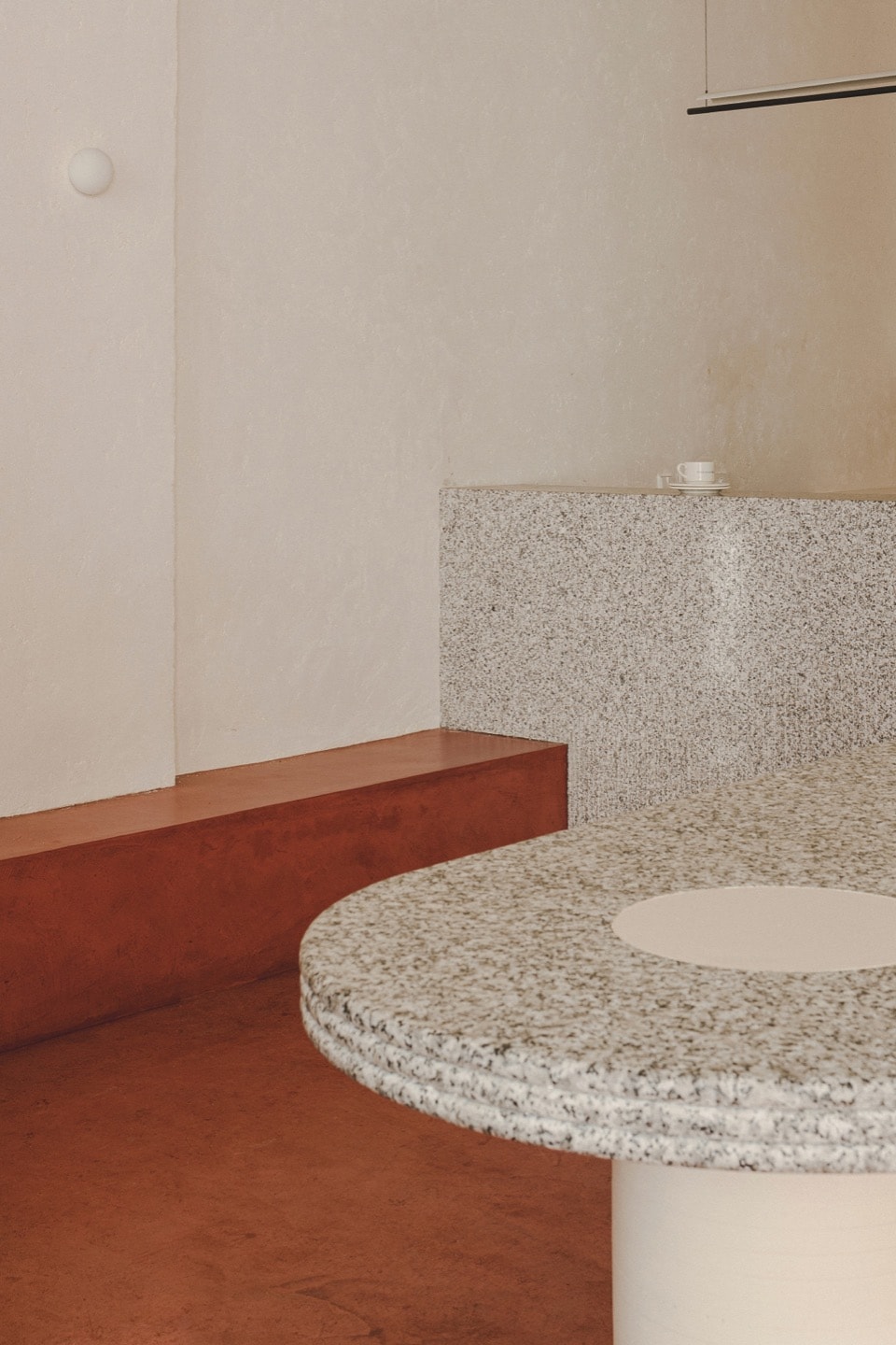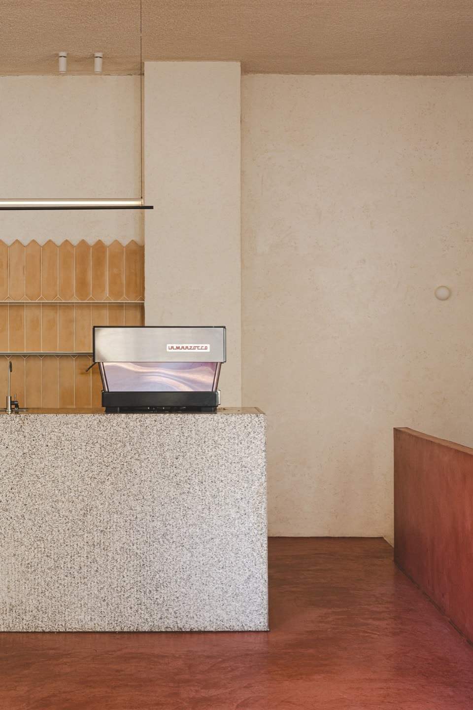 En primer lugar, la barra, uno de los elementos más característicos del café de especialidad, se ubica en el extremo trasero y se le dota de gran carga expresiva ya que se recubre por completo con granito. Funciona como telón de fondo y, a la vez, como lugar de referencia.