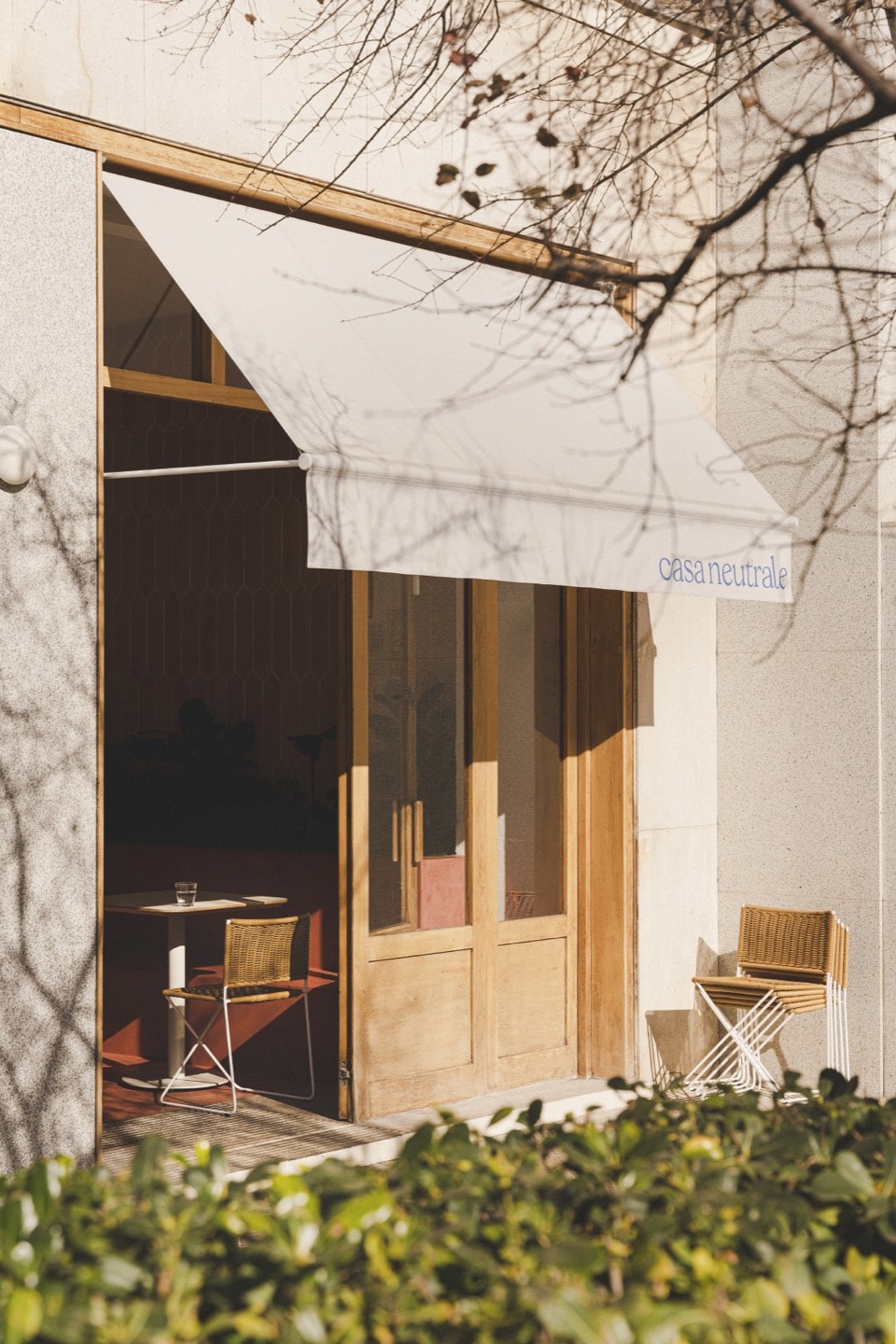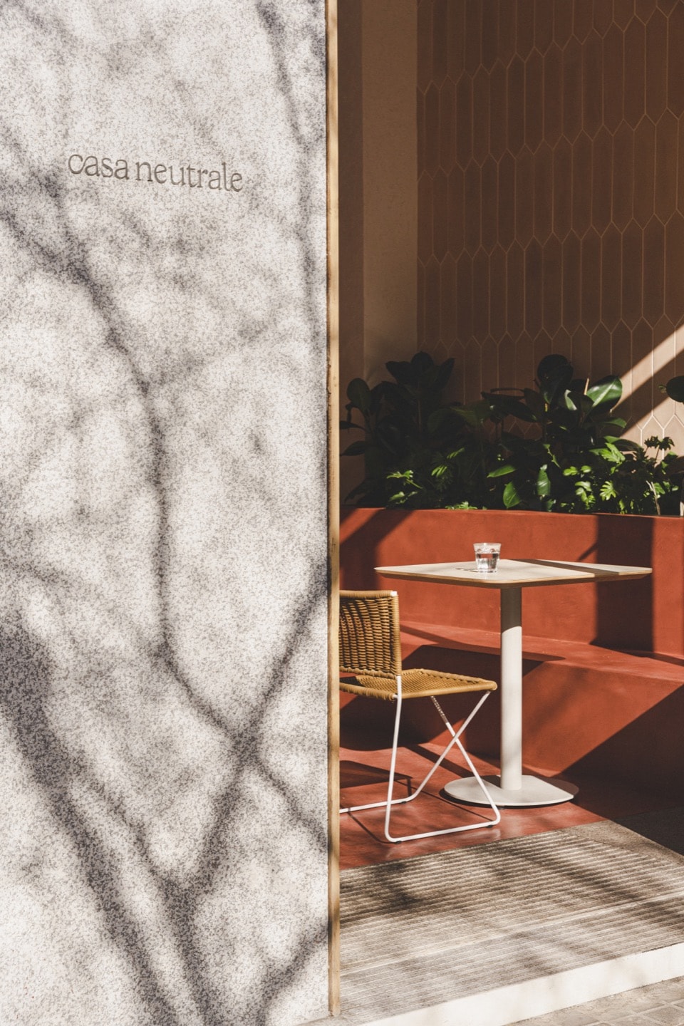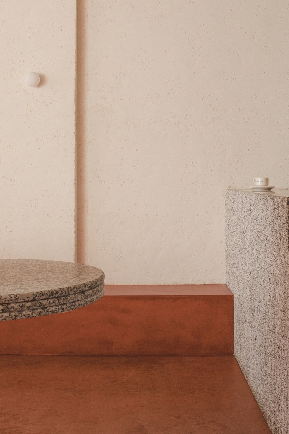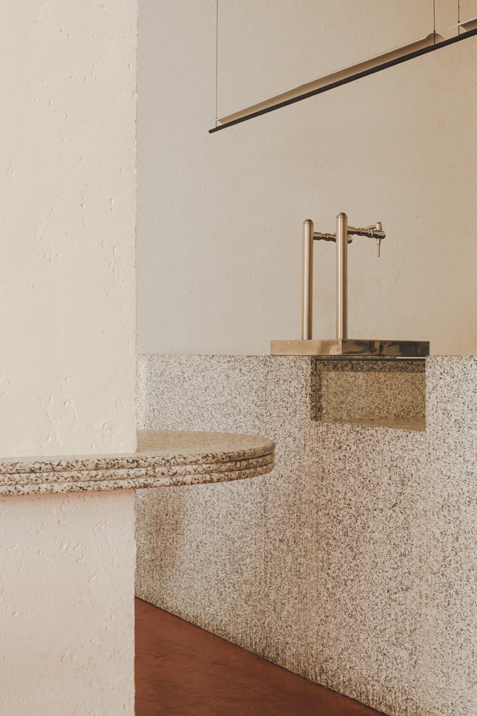 En primer lugar, la barra, uno de los elementos más característicos del café de especialidad, se ubica en el extremo trasero y se le dota de gran carga expresiva ya que se recubre por completo con granito. Funciona como telón de fondo y, a la vez, como lugar de referencia.