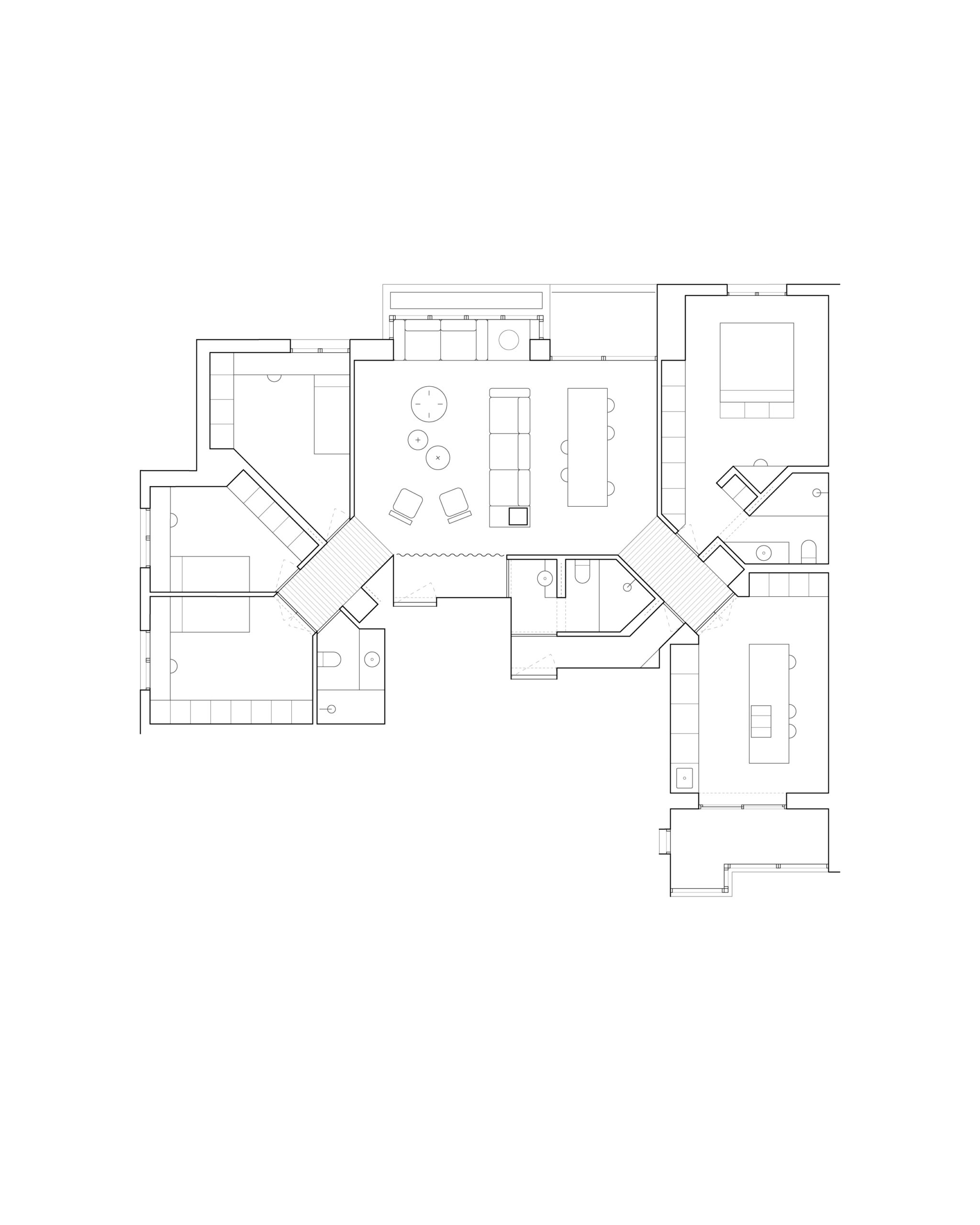 La principal estrategia se basa en una composición definida mediante dos líneas que se giran 45º. Esto da lugar a dos diagonales de notable presencia que aportan un orden singular. La intersección de estos ejes confluye en el salón, el cual es concebido como el principal espacio de la vivienda. Esta zona de día se erige como el centro de la casa y desde ella se conecta con cada una de las estancias que definen la vivienda.