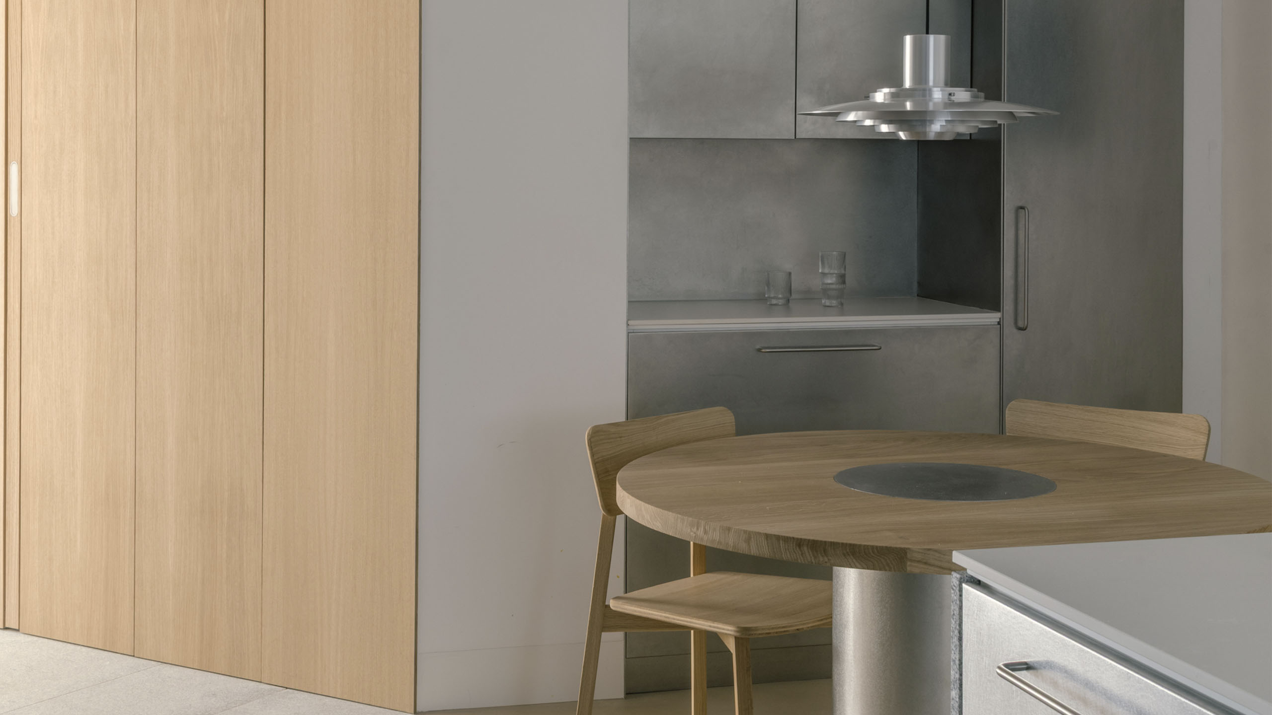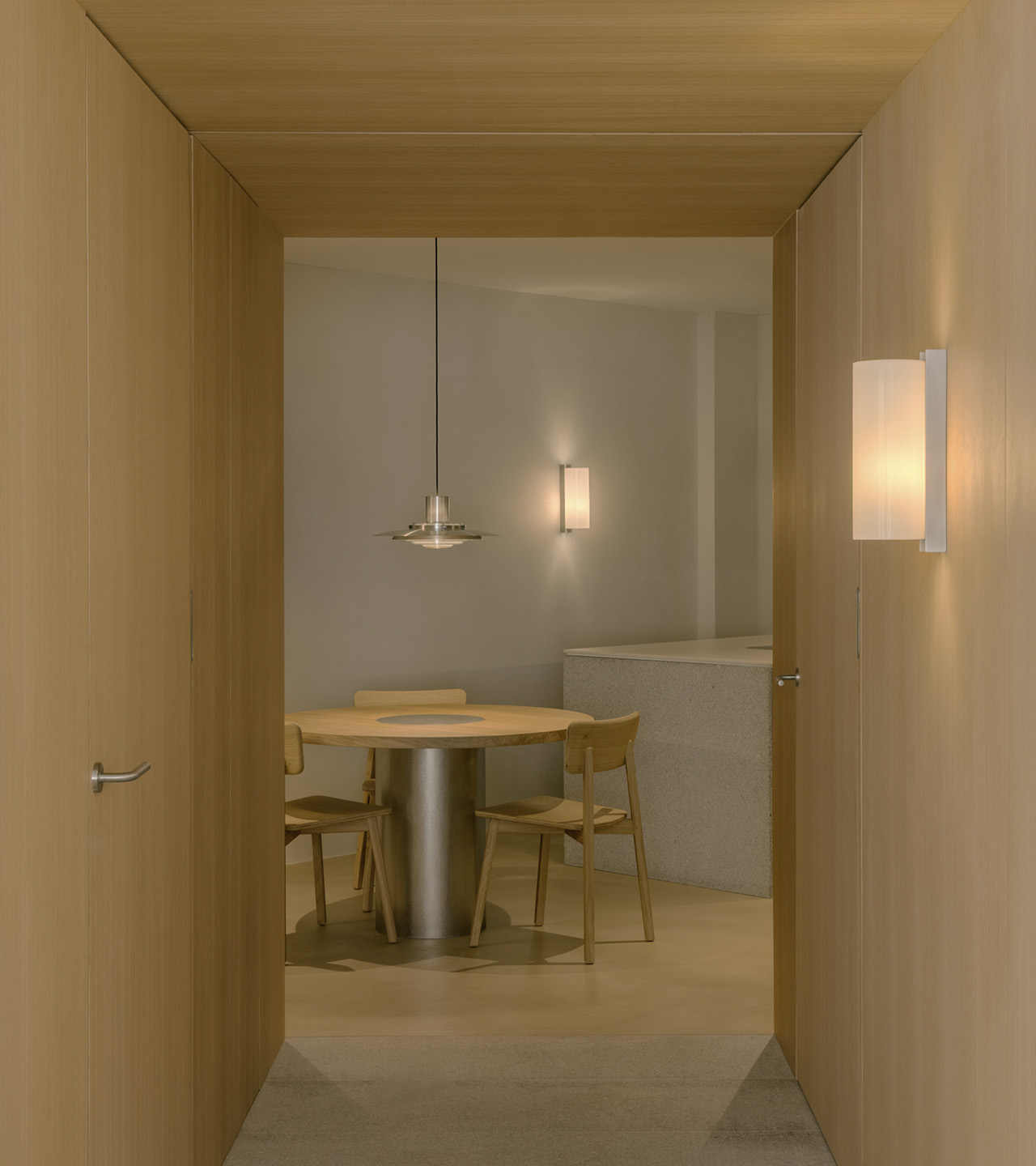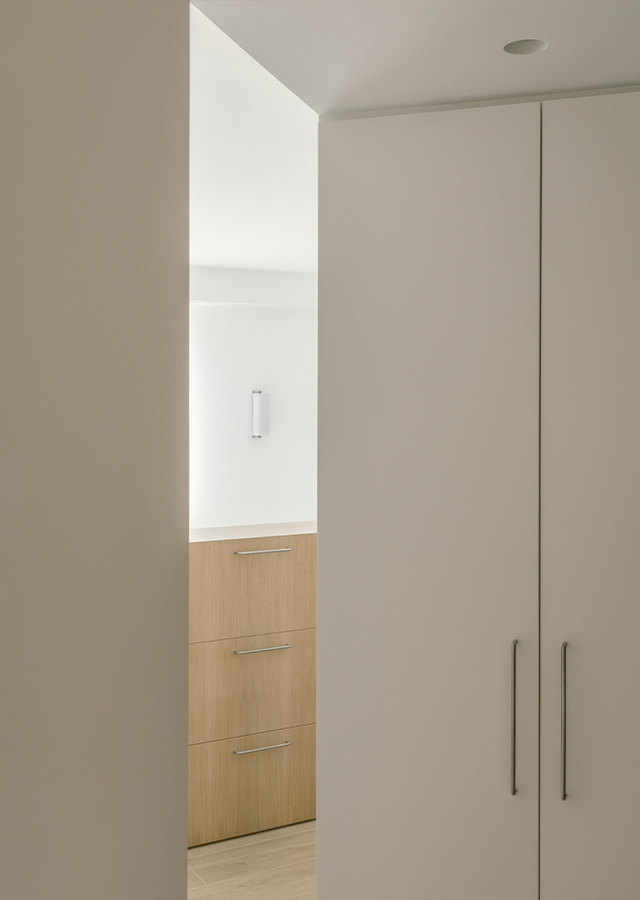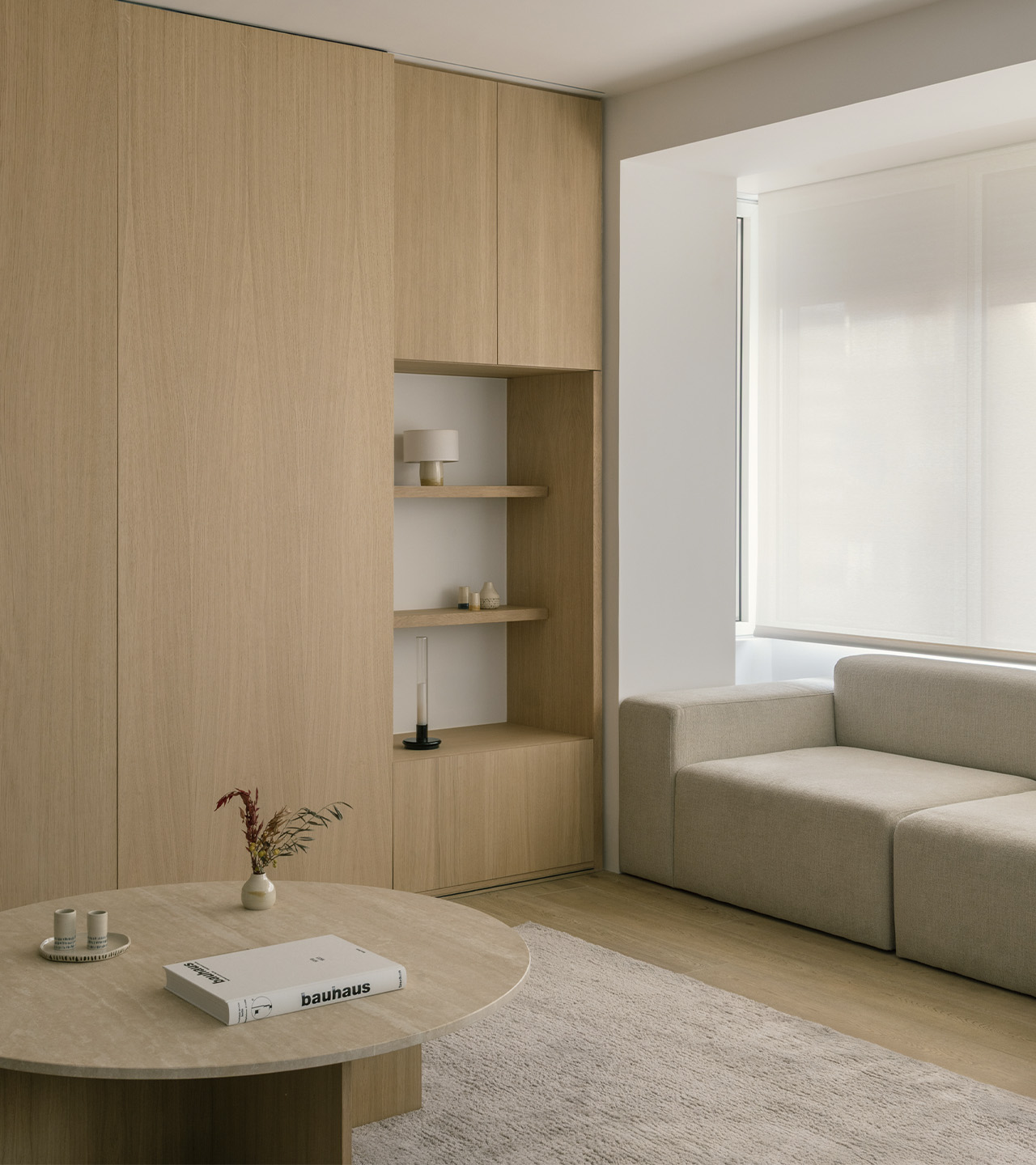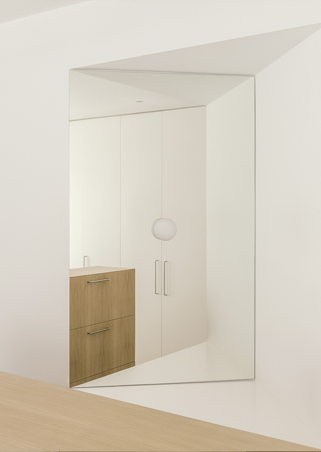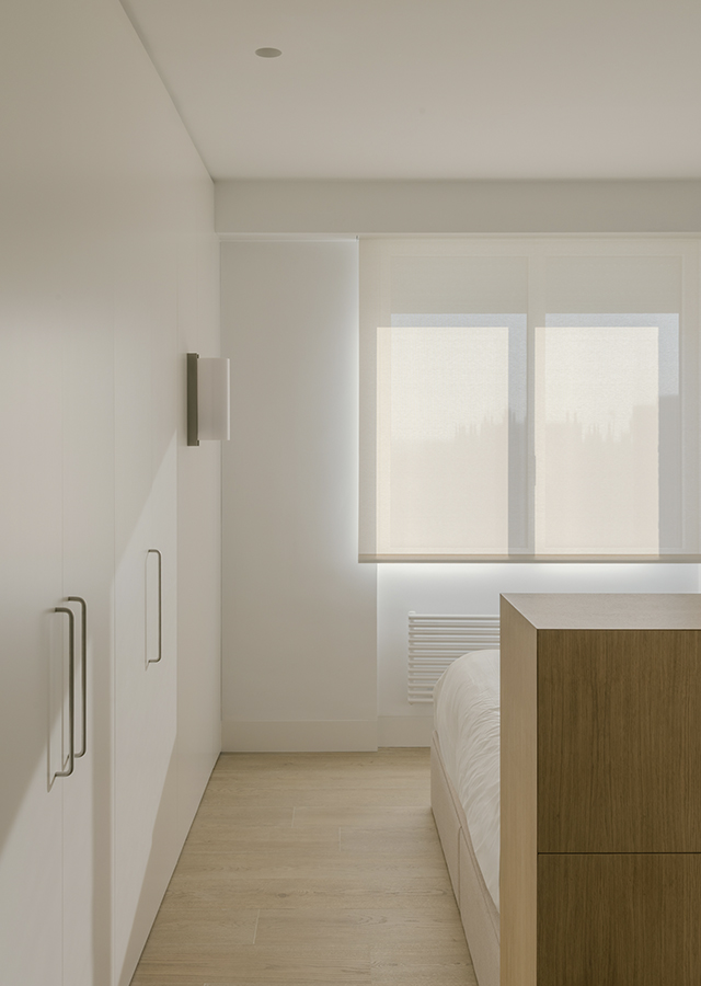 Esta zona de día se erige como el centro de la casa y desde ella se conecta con cada una de las estancias que definen la vivienda. Por un lado, la diagonal izquierda da acceso a una zona de noche que alberga tres dormitorios. Por otro, la diagonal derecha conecta con la cocina y con el dormitorio principal. De este modo se consigue una organización en la cual todas las estancias buscan abrirse hacia el perímetro exterior.