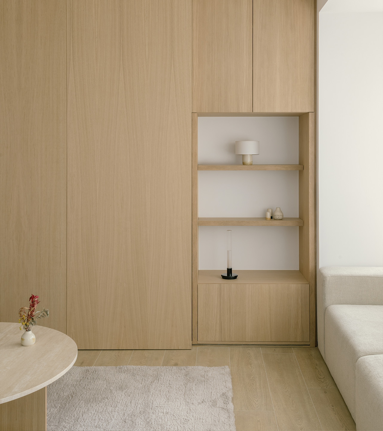 La calidez con la que se concibe el espacio se consigue por medio de la madera. Los revestimientos de suelos y paredes se combinan a su vez con paños de piedras y aluminio. La estética general de la vivienda apuesta por el uso de materiales naturales y nobles.