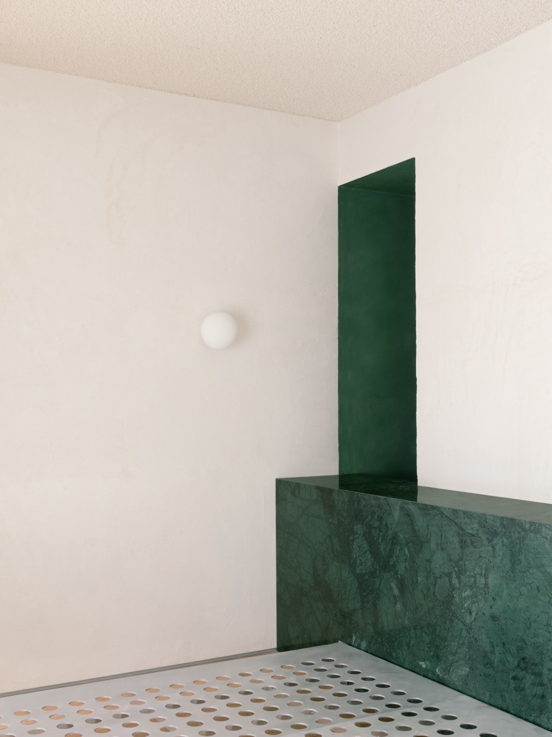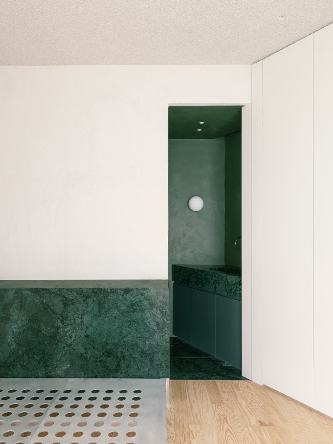 Los toques llamativos los aportan dos materiales muy característicos: el mármol verde indio inunda los baños y aporta expresividad. Mientras que el acero inoxidable se emplea para diseñar piezas singulares como la isla o los frentes de cocina.