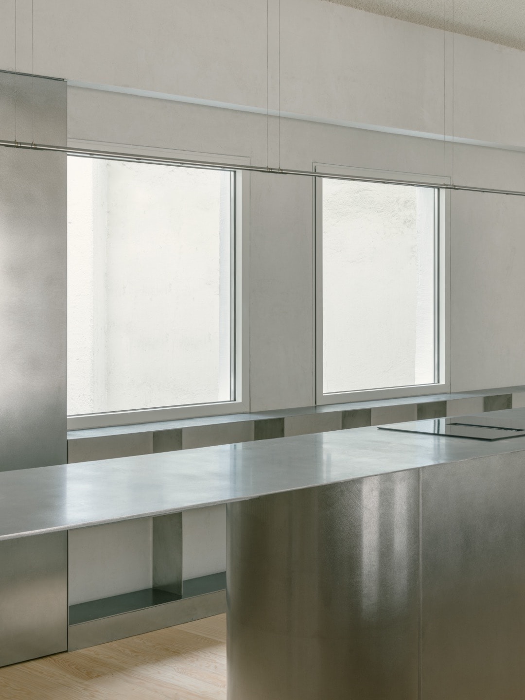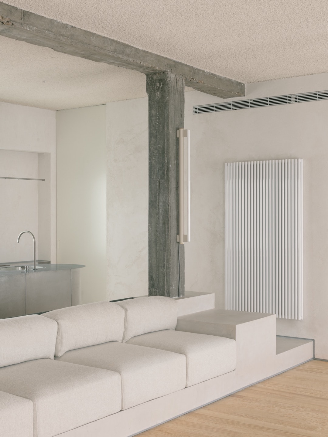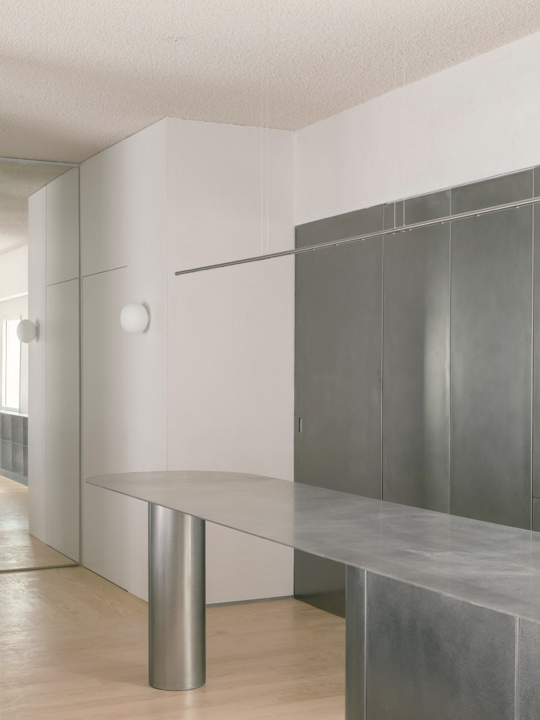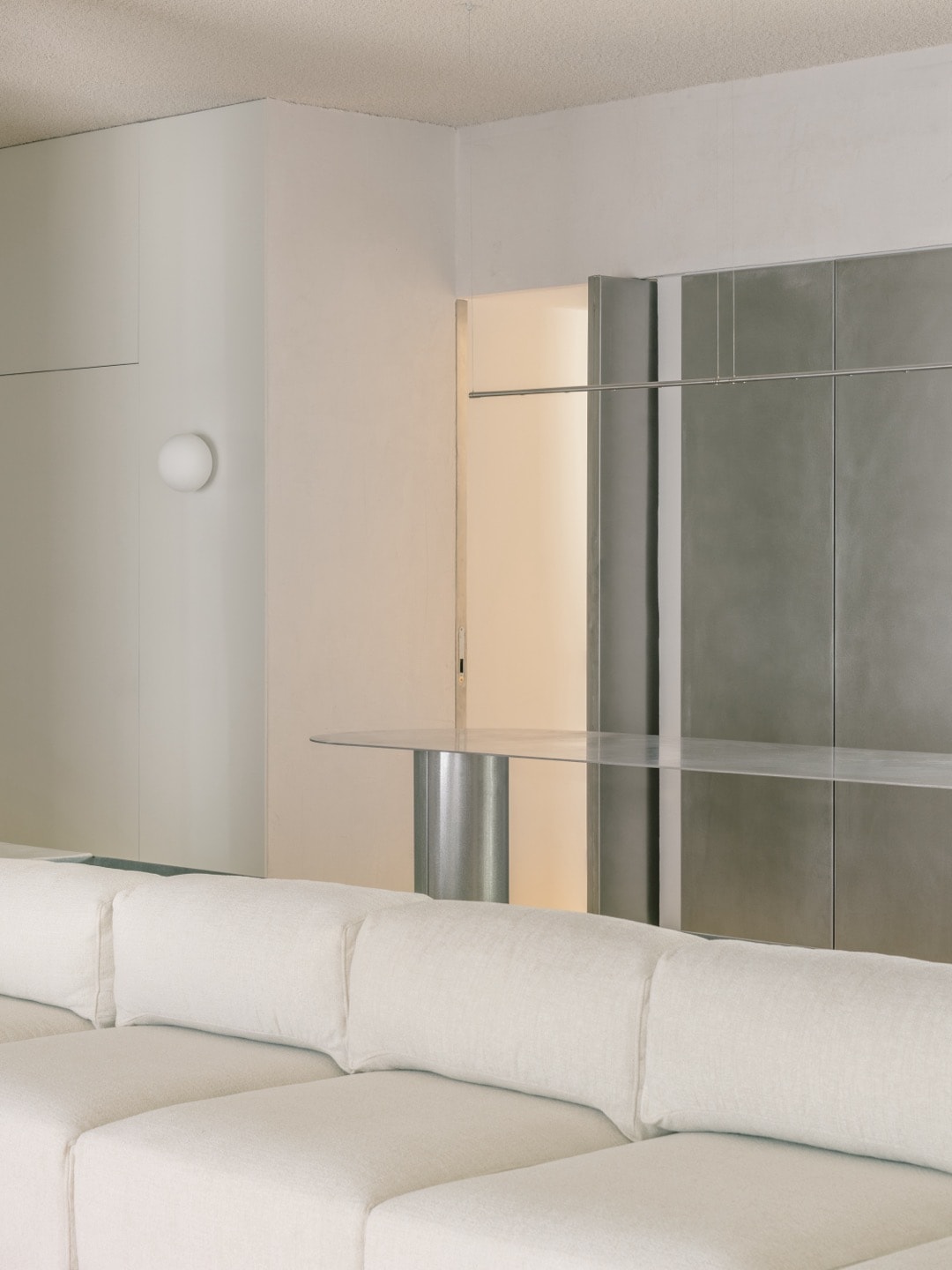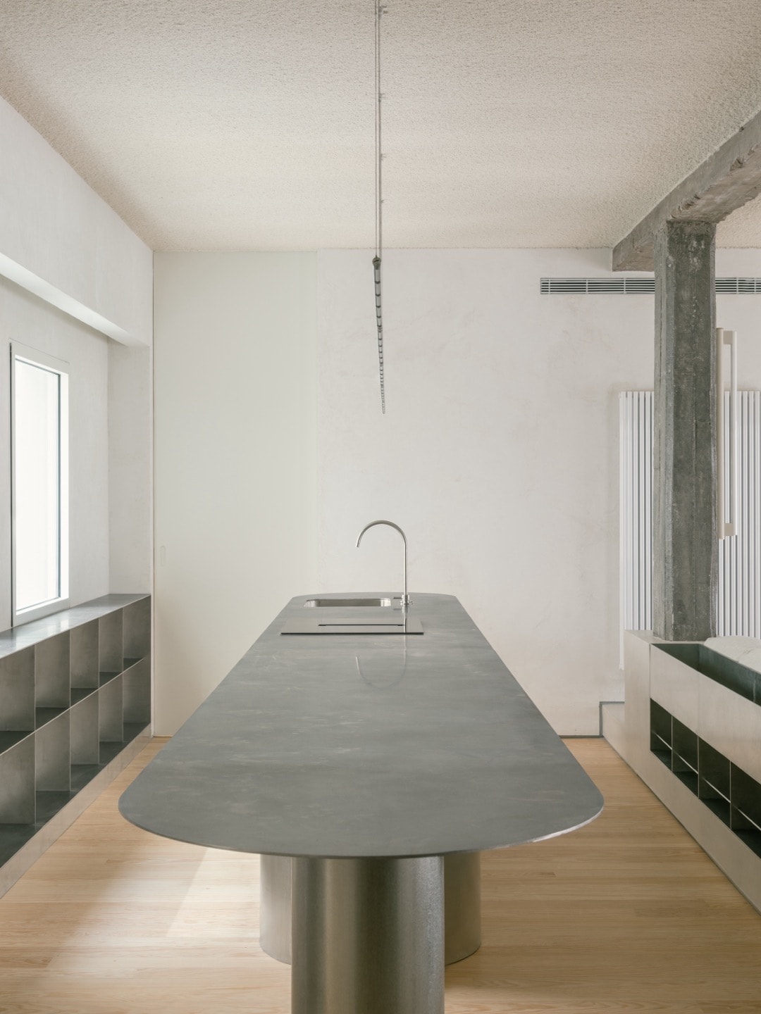 Este lienzo en blanco se convierte en el centro neurálgico de la casa. Un espacio que es utilizado de forma flexible y que acoge los dos elementos más característicos de la vivienda: la imponente isla de acero y el gran sofá. Ambas piezas jerarquizan el espacio, pero, a la vez, mantienen autonomía suficiente para que el resto de la sala pueda ser vivida de manera espontánea.