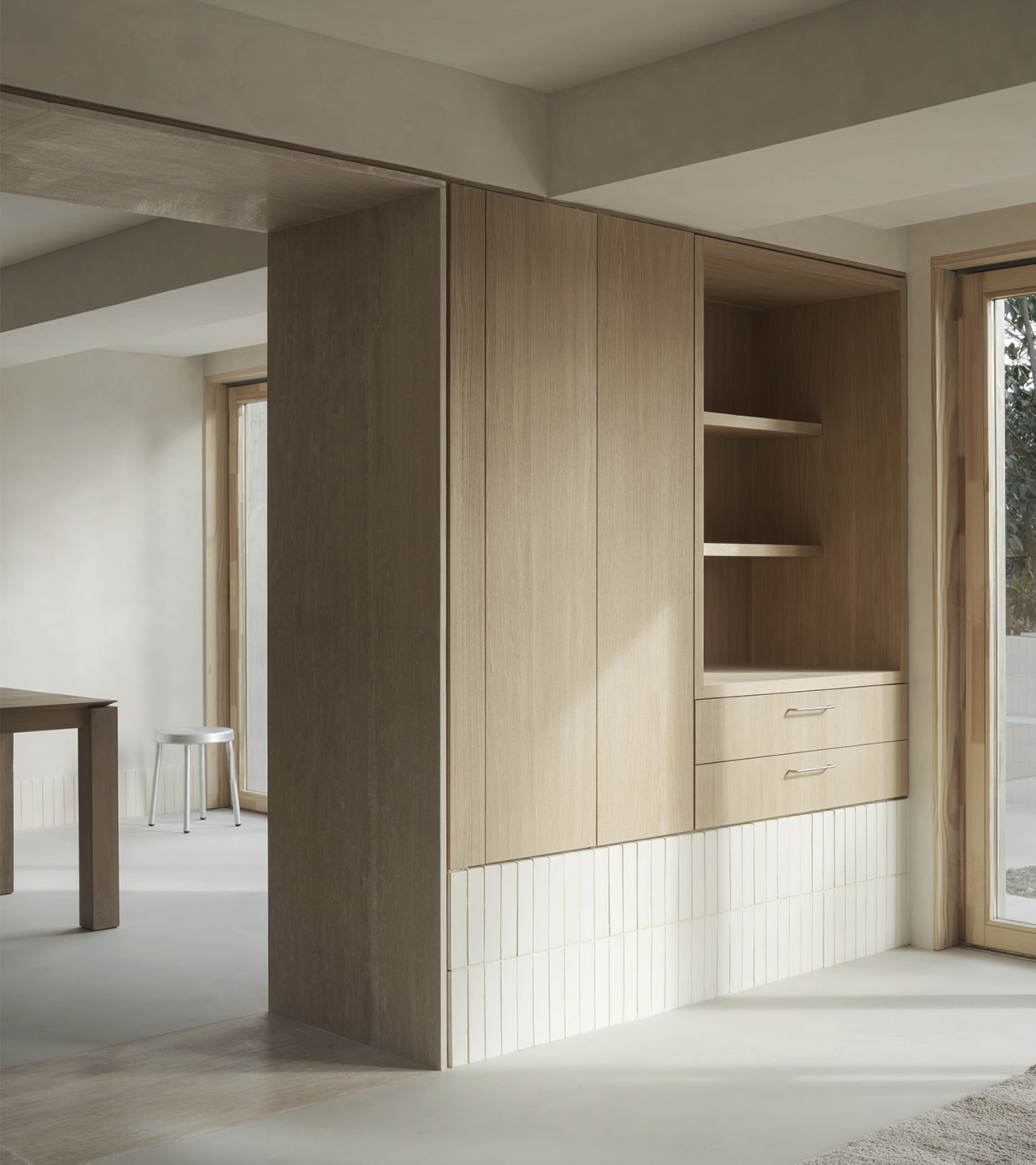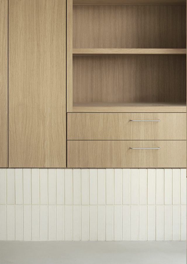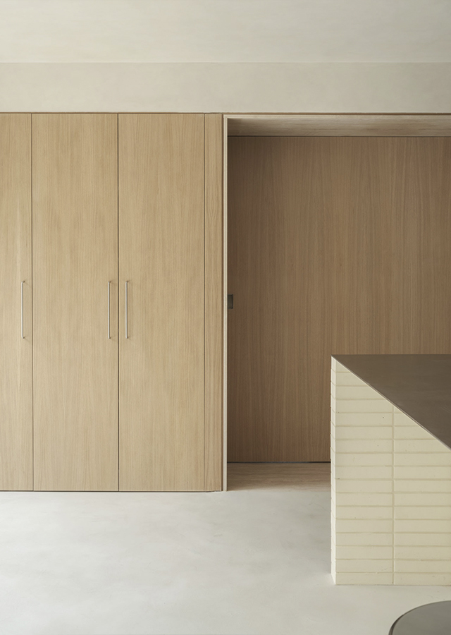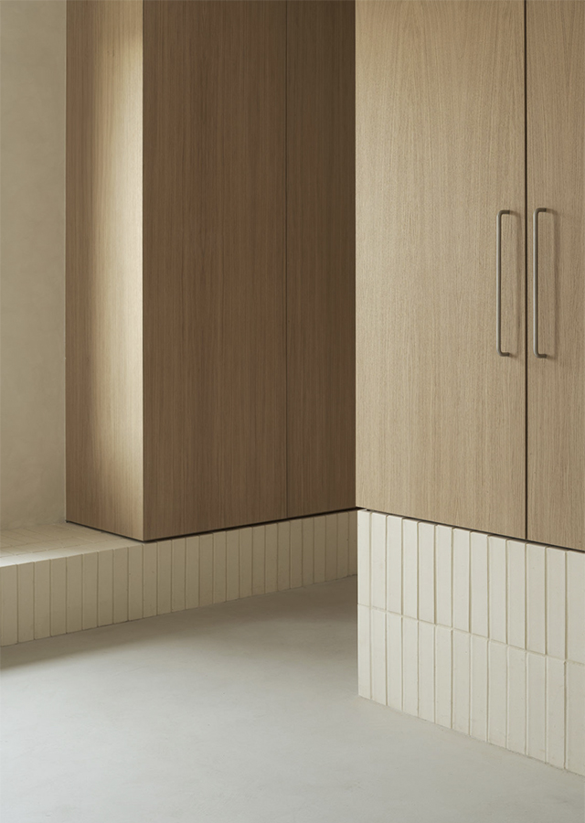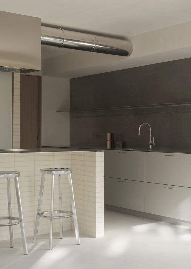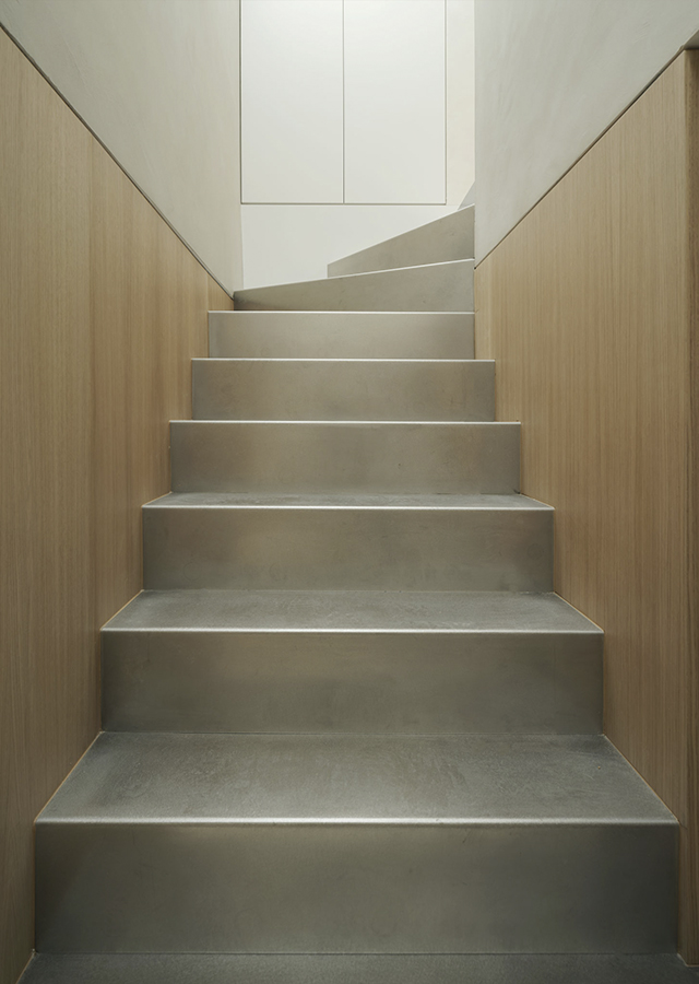 La versatilidad de esta solución material ayuda a construir el contenido y continente de toda la casa, mientras que su expresividad da carácter a cada atmósfera.