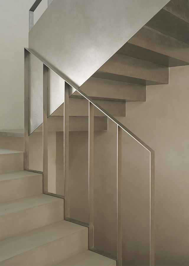 Ese ladrillo se combina con otros materiales también naturales como la madera de roble o el mármol travertino. Conectando plantas, una imponente escalera realiza en acero inoxidable preside el hall de entrada y da la bienvenida.