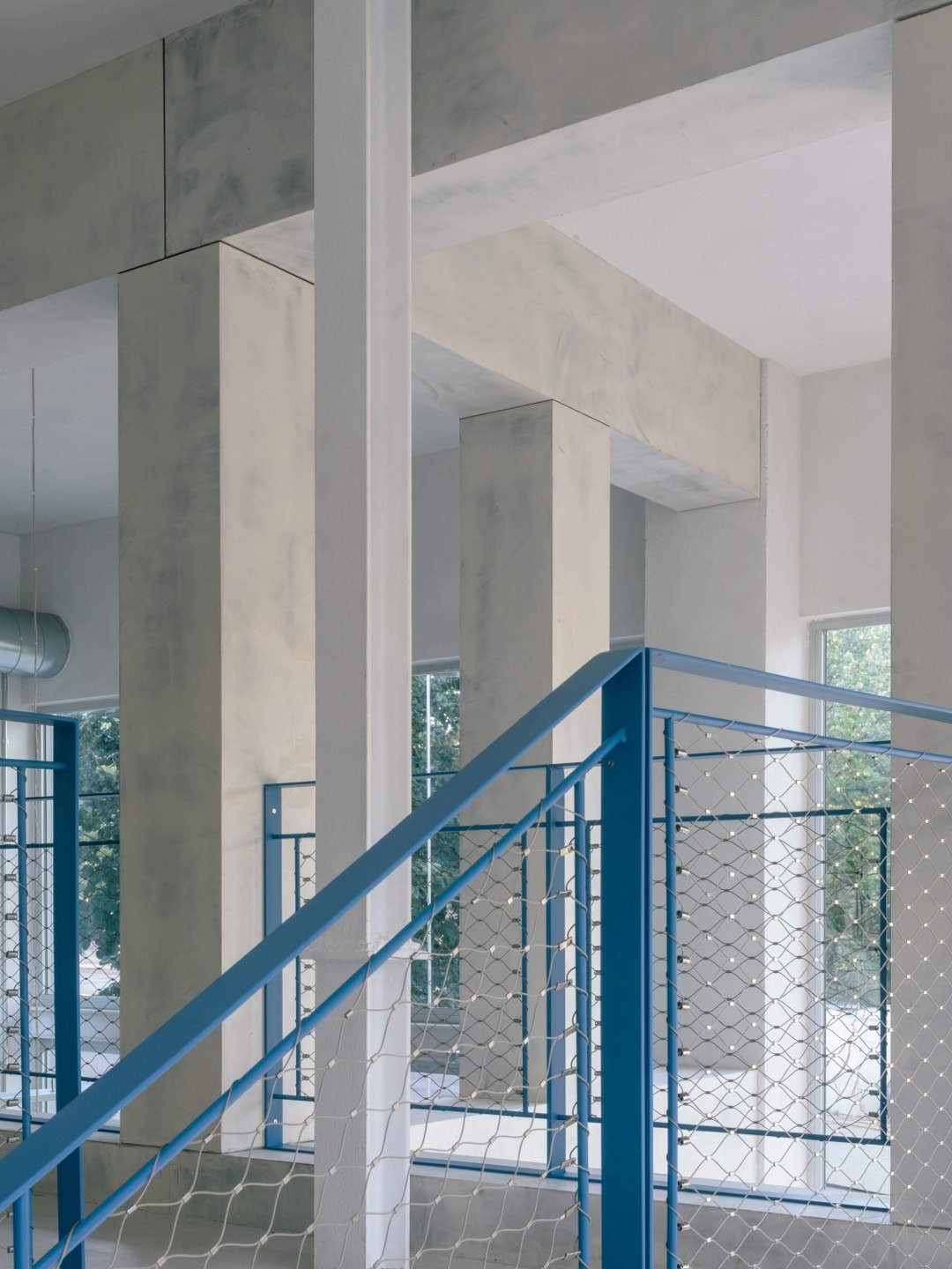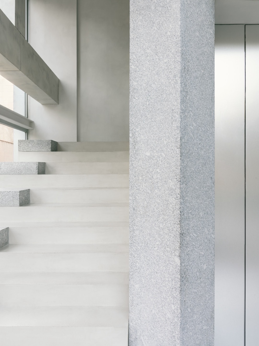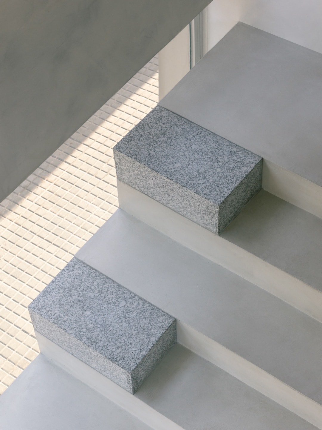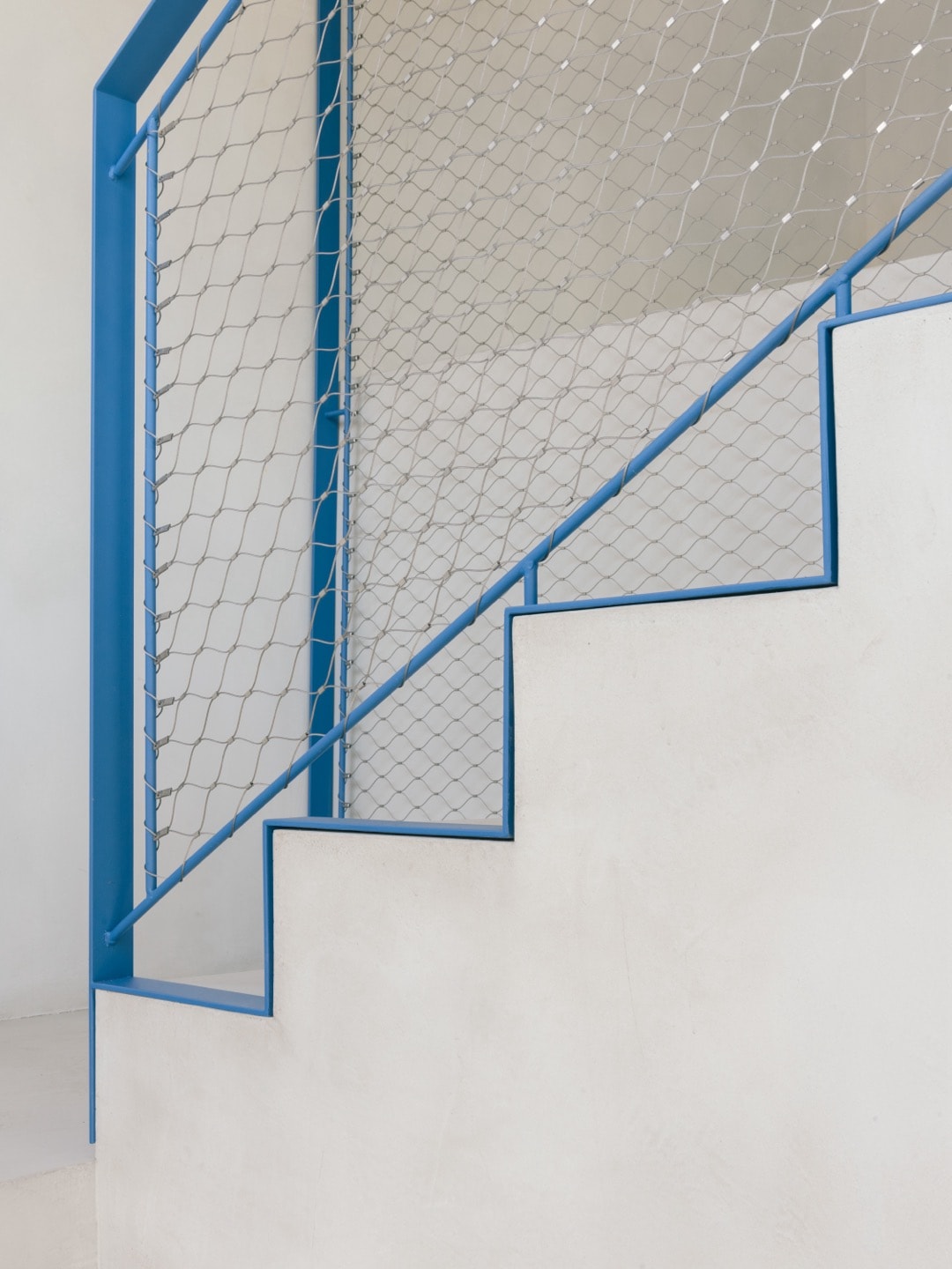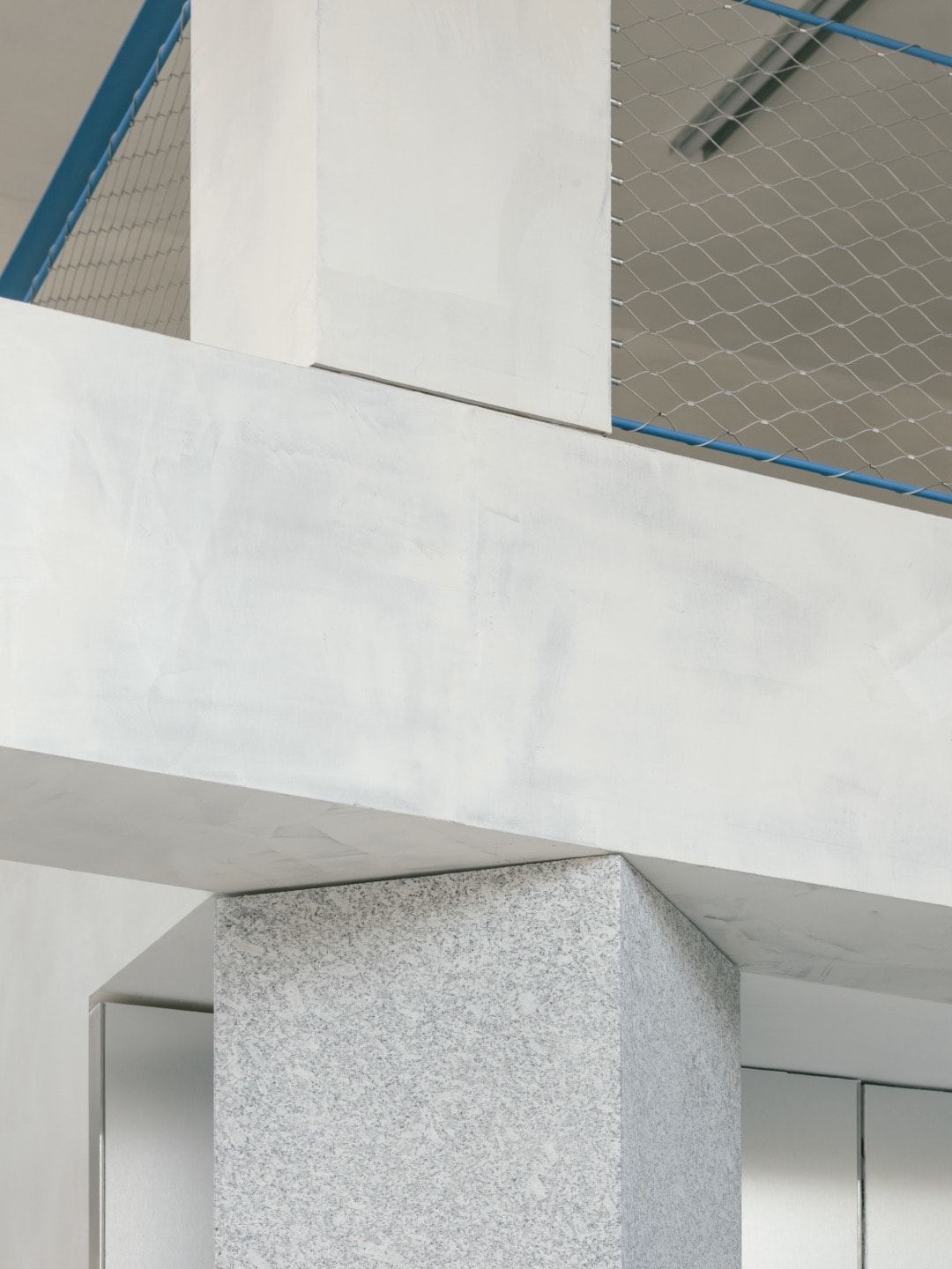 La combinación de materiales propone una paleta homogénea y uniforme. Los tonos grisáceos son aportados por el granito y el acero. También por el microcemento y el alicatado. Esta mezcla de materiales planos contrasta con la introducción del azul característico de la marca. Este toma un protagonismo sutil en elementos concretos como las barandillas.
