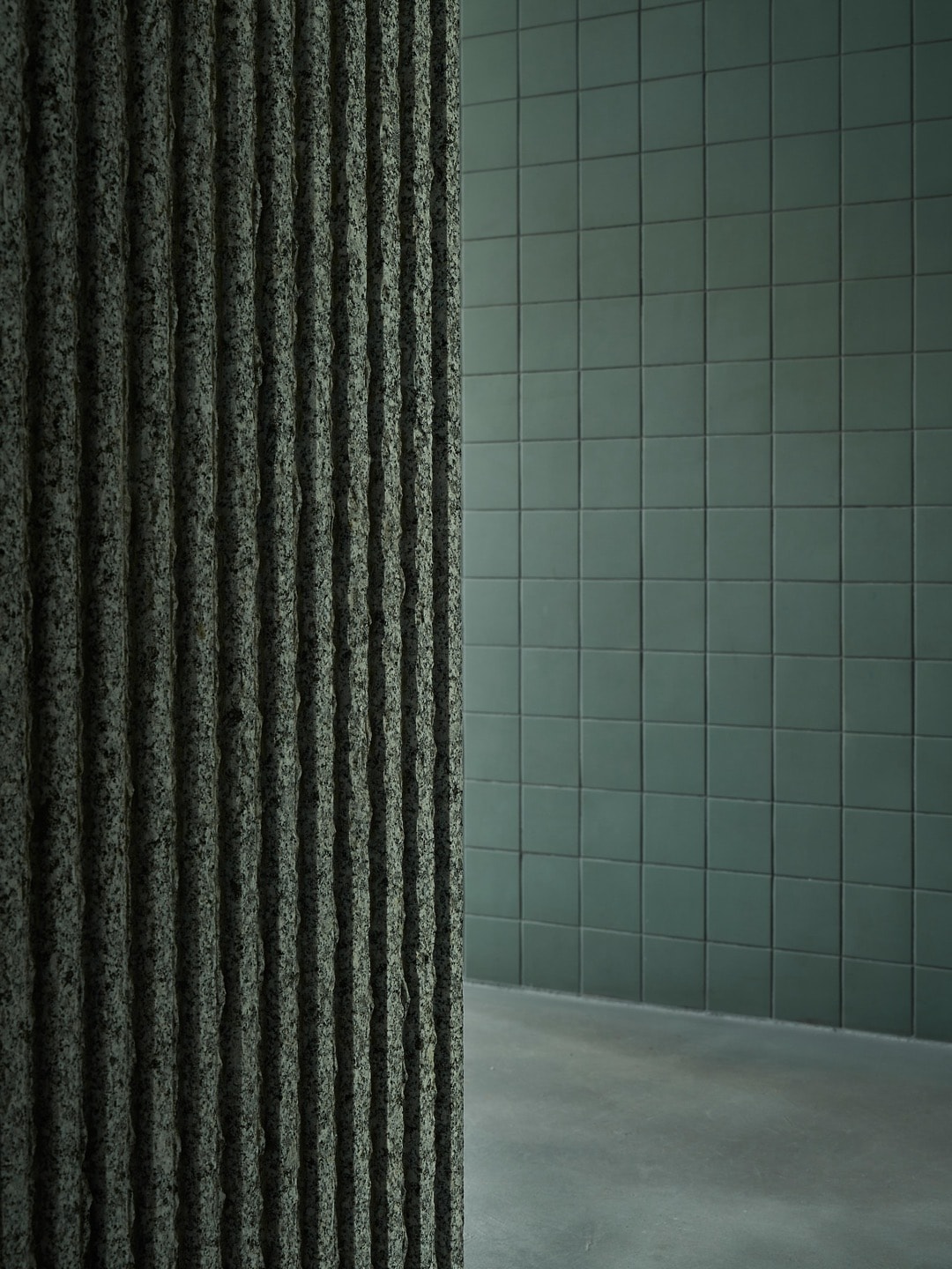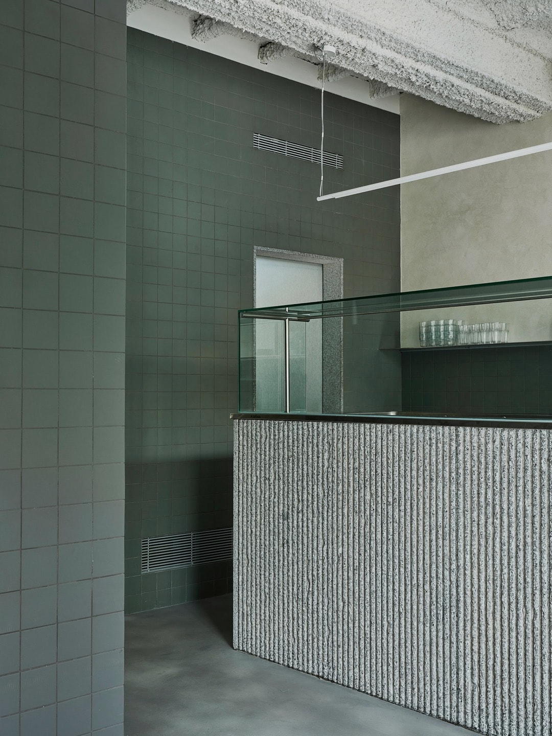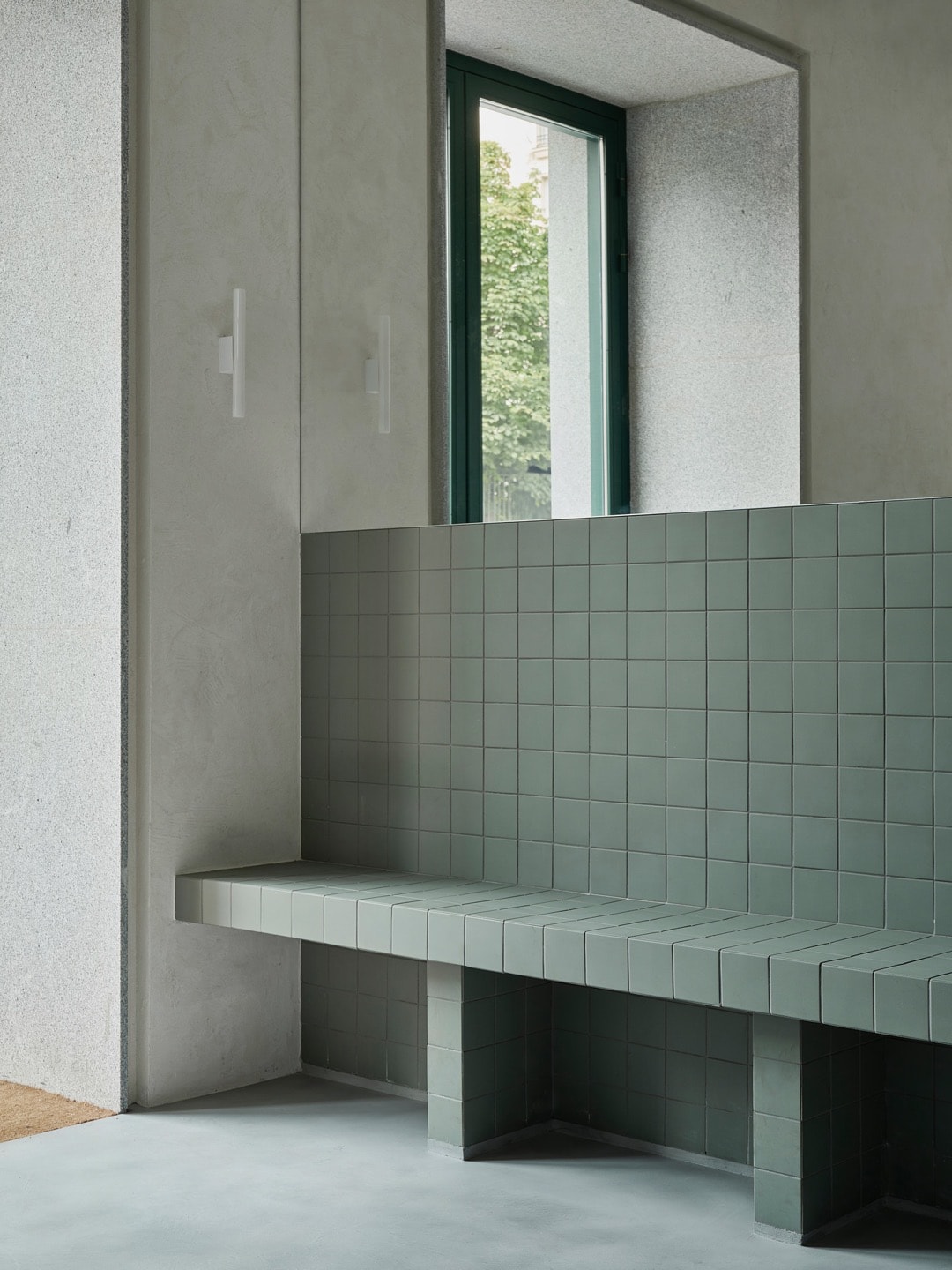 El resto del espacio se limpia para recibir una bancada y unas pequeñas mesas. El alicatado de tonos verdes inunda la totalidad del espacio y permite, mediante el empleo de una sola pieza, aportar identidad. Este toque de color dialoga muy bien con la geometría de los techos, la cual aporta singularidad.