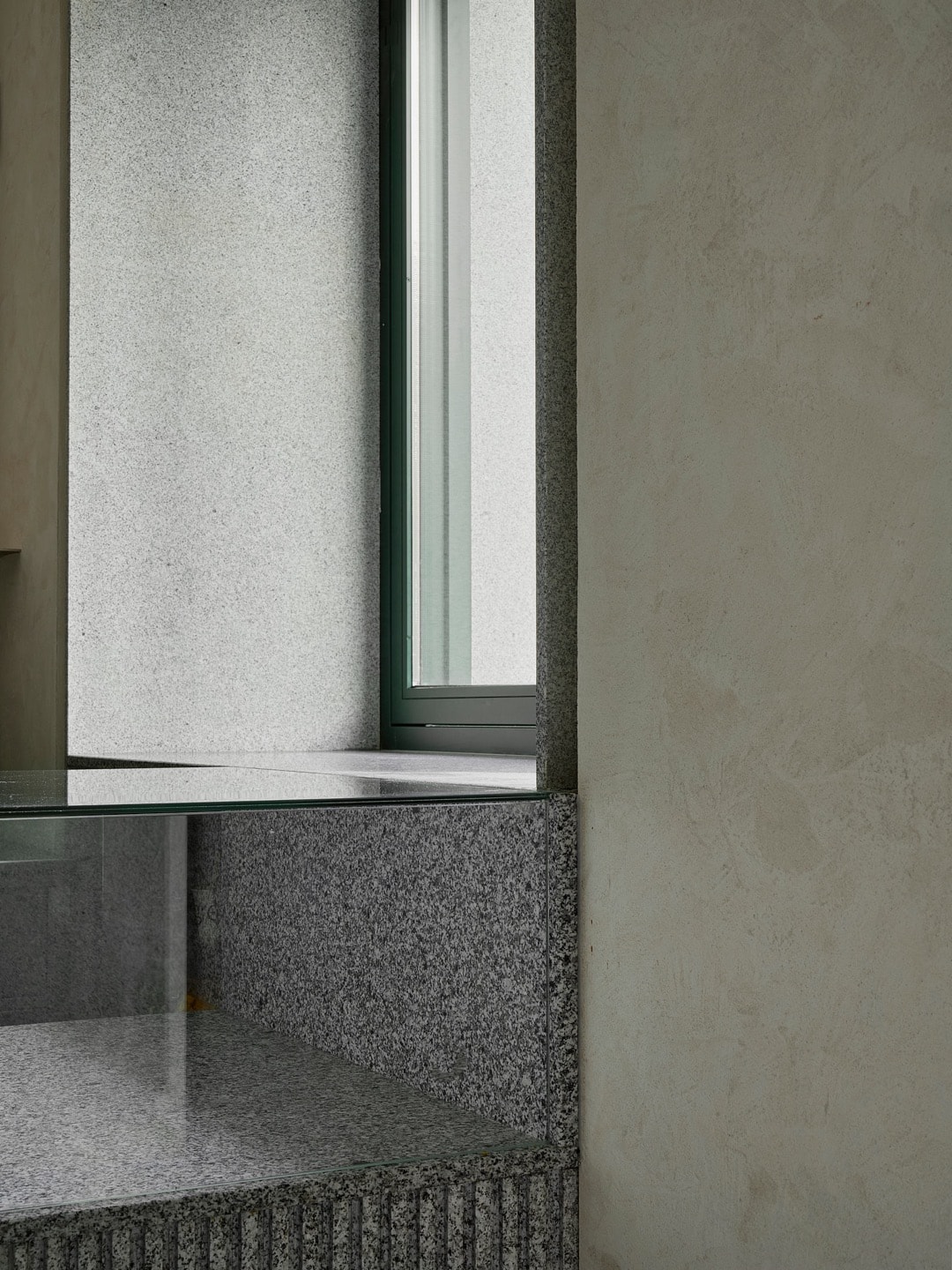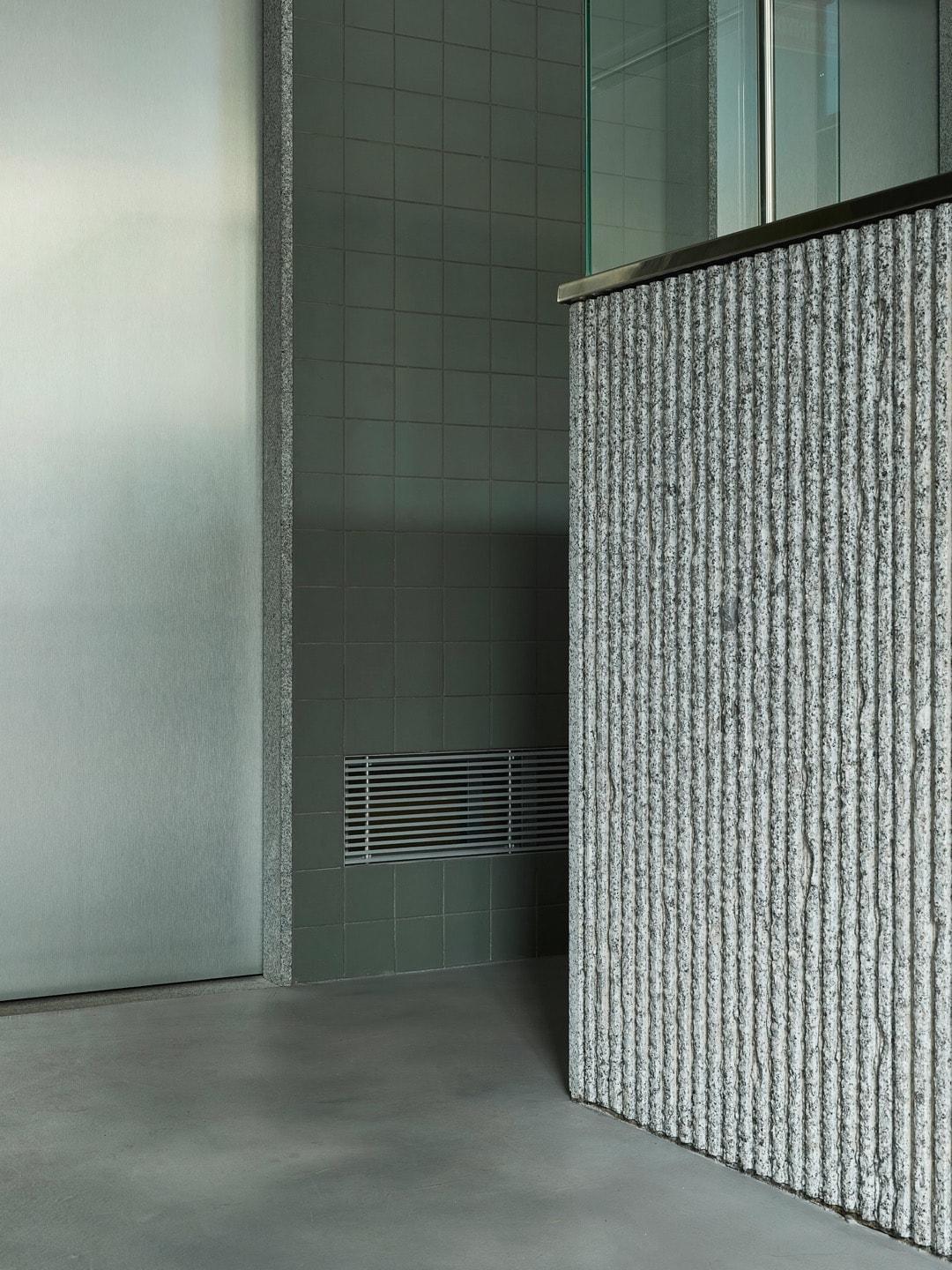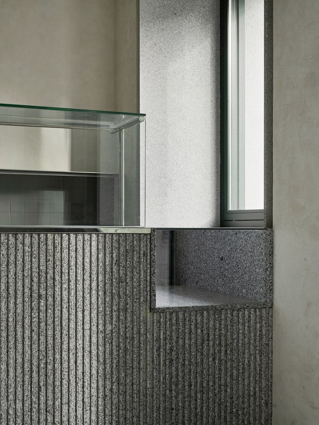 De este modo, se analiza la manera de sacar el mayor rendimiento a la barra – mostrador. Se apuesta por un elemento recubierto de granito que es colocado en el centro de la composición y determina el funcionamiento de la actividad. Esta gran barra hace las veces de zona de preparación de pedidos, pero, a su vez, se relaciona con el público.