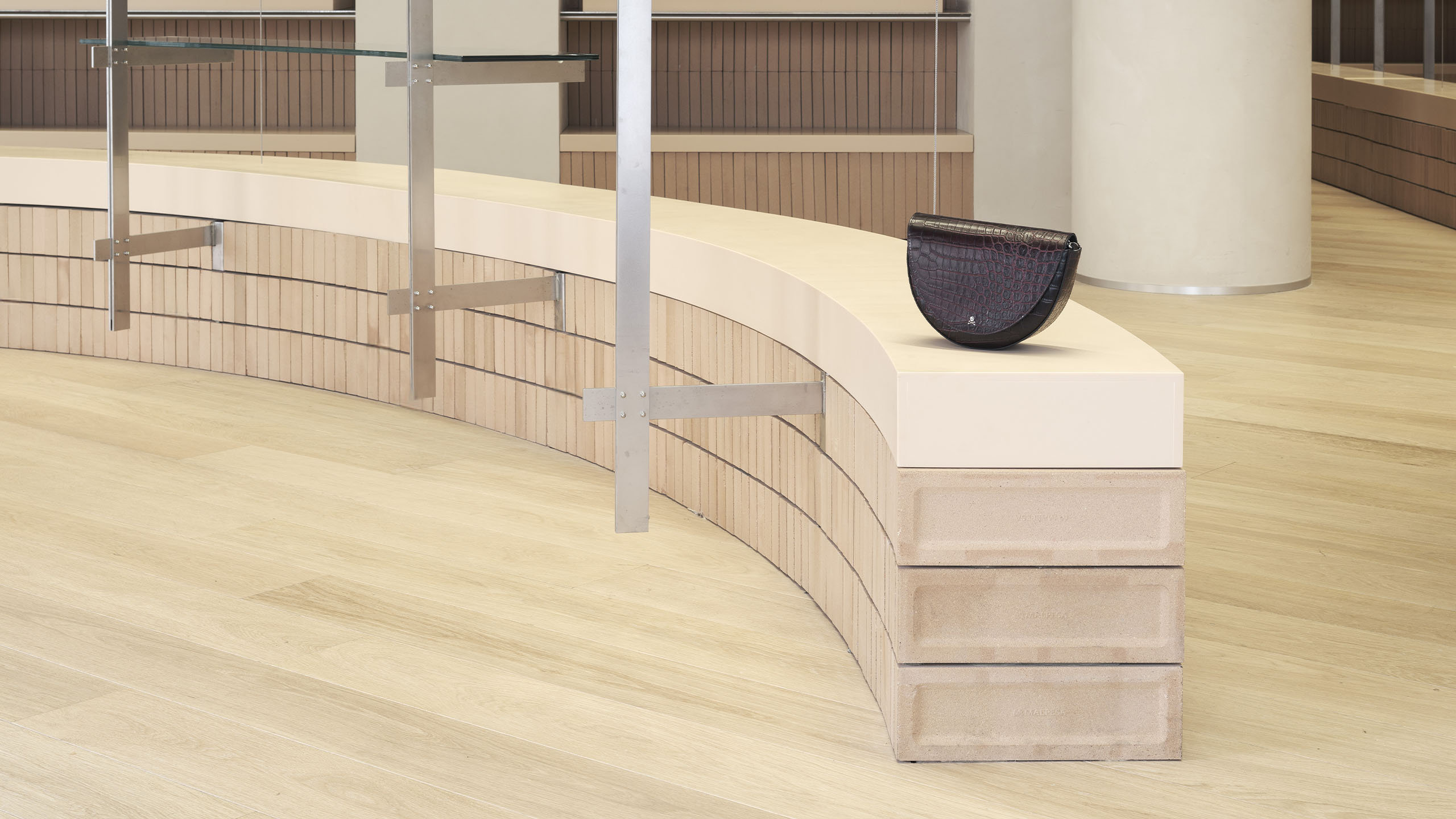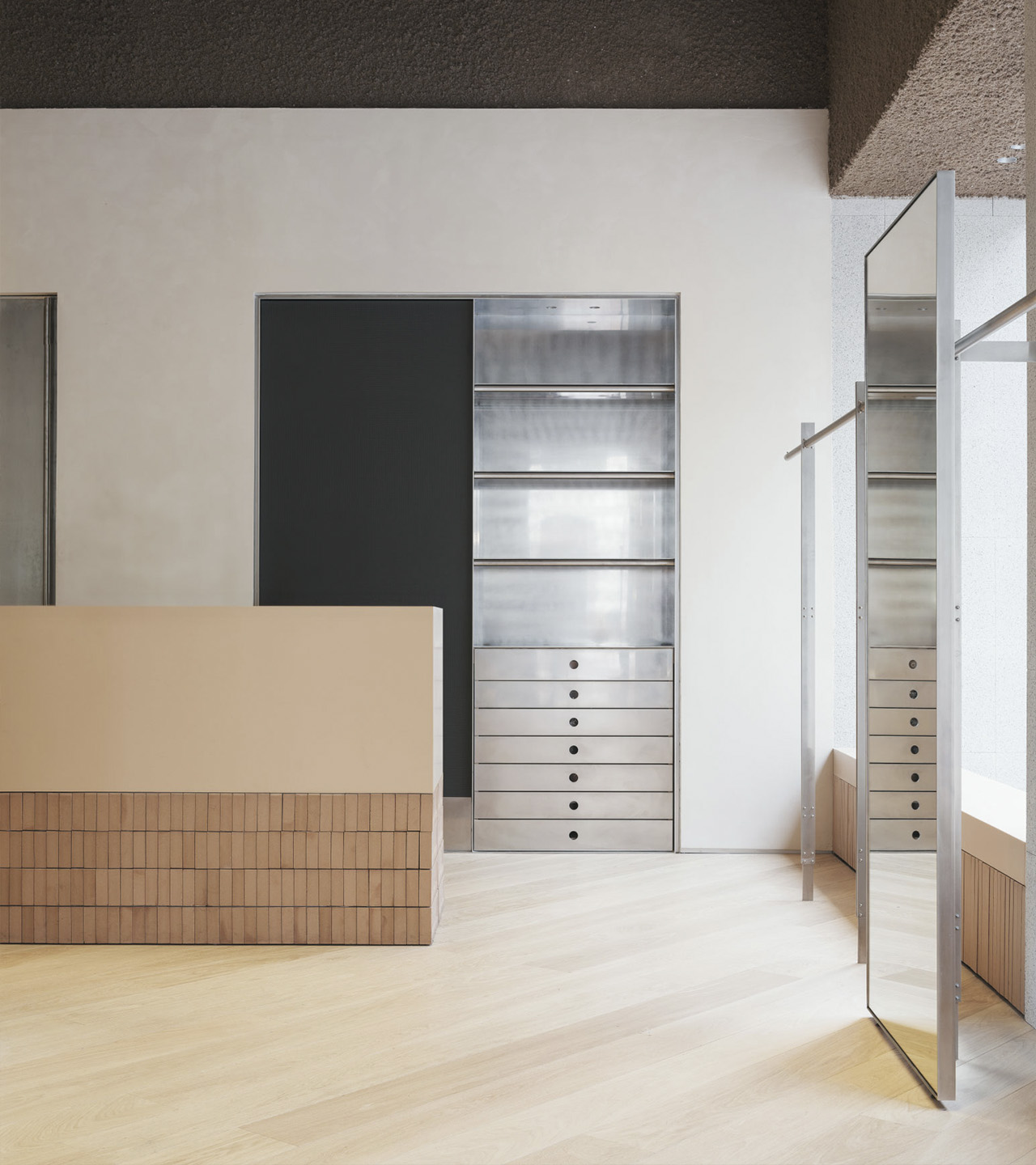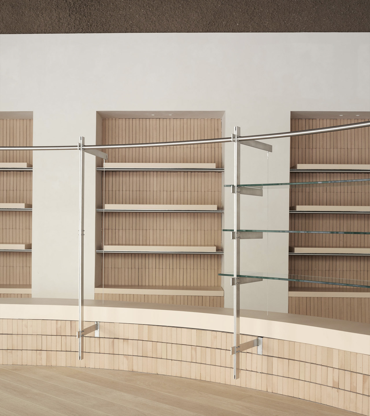 Esta calidez entra en contraposición con el uso de materiales más sofisticados e innovadores como es el caso del acero o del Krion. El primero de ellos es empleado para el diseño de los soportes expositivos verticales mientras que el segundo remata y caracteriza muchos de los dispositivos geométricos.