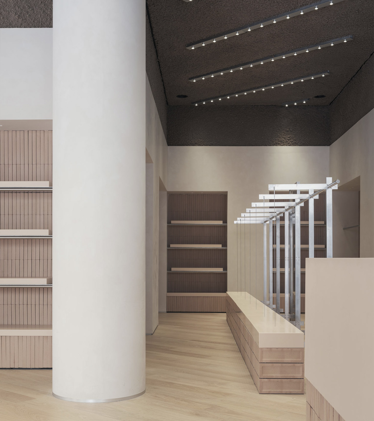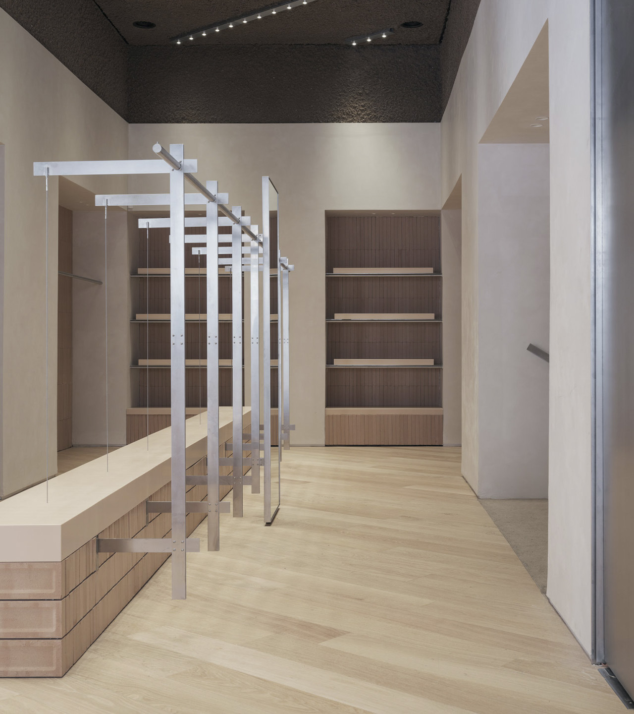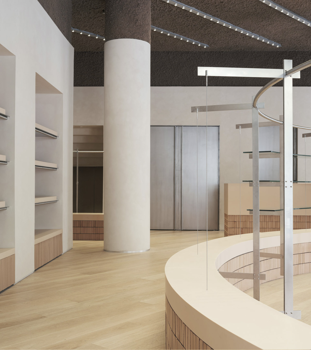 Esta suma de acciones construye un recorrido que pretende embaucar y despertar la atención del viandante. Desde el exterior, se diseñan unos escaparates cuya limpieza y sobriedad contrasta con la expresividad del interior. Una vez dentro, la monumentalidad del espacio sugiere una especie de experiencia inmersiva que conecta con la exposición de prendas. En definitiva, el afán por acentuar la sorpresa recae sobre un diseño que apuesta firmemente por el empleo de soluciones innovadoras y por el cuidado máximo del detalle.